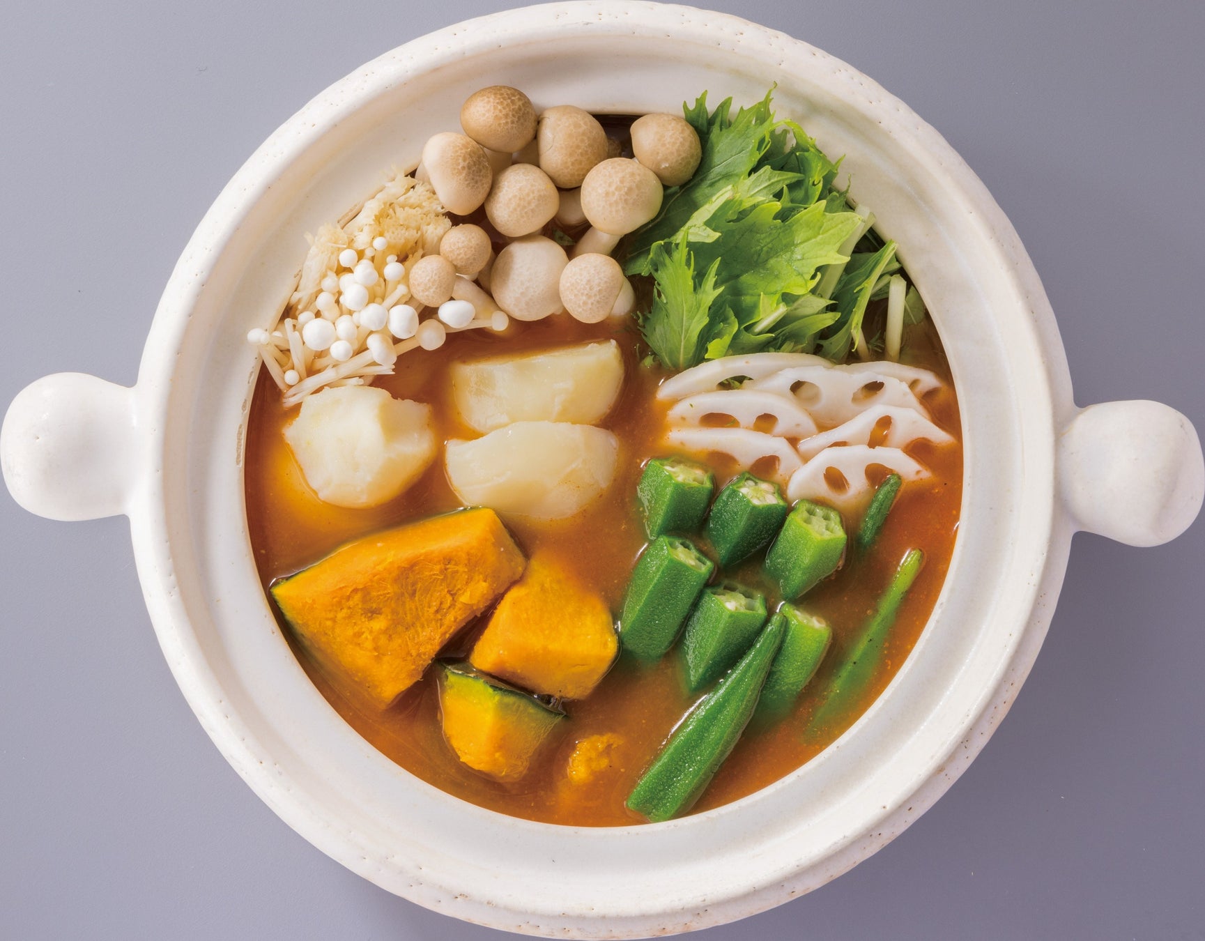 トマト、鶏がらだし、あごだしなどの合わせスープに、11種類のスパイスを調合した風味豊かな新だし。新登場の北海道産の「かぼちゃ」「じゃがいも」と組み合わせると本格的なスープカレーを楽しめます。