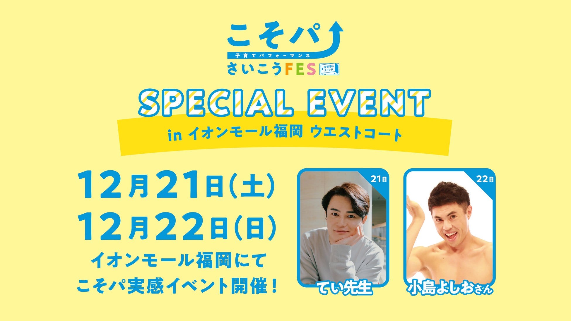 12月21日(土曜日)は、SNSで大人気の育児アドバイザー「てぃ先生」、12月22日(日曜日)は、子ども向けのお笑いライブでも大人気の「小島よしおさん」がステージイベントに登場します。