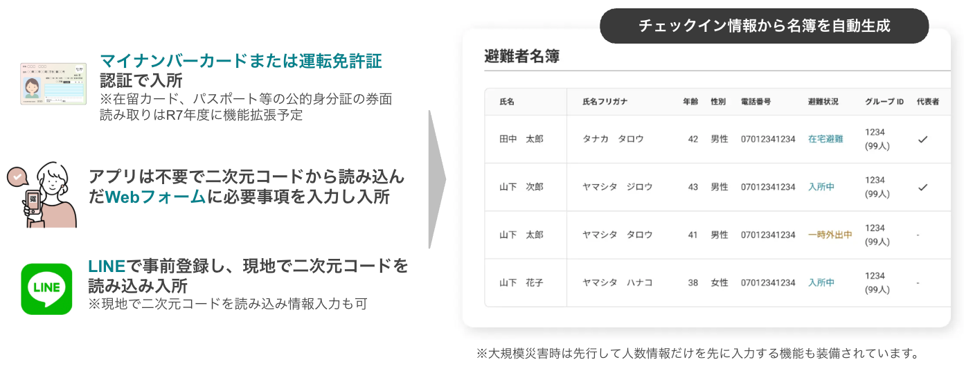 ②QR読取でWebフォームに入力:避難者が避難所入所時にカメラでQRを読み取り、WEBフォームから情報入力を行う