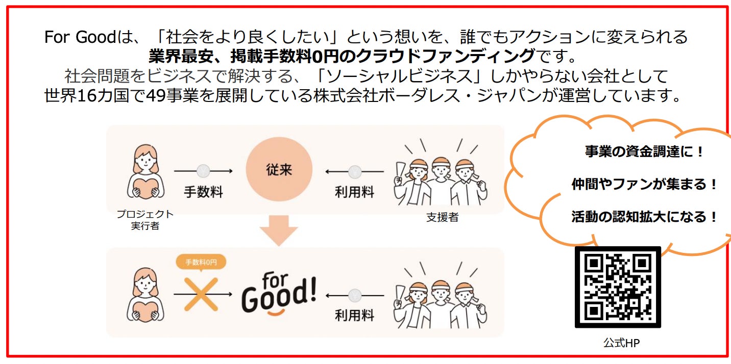 For Goodはこれまでも、「掲載手数料0円のクラウドファンディング」として、お金や時間などのリソースを節約しながらクラウドファンディングを立ち上げ、1円でも多くの資金を社会課題解決の活動に充てたい方を中心にソーシャルビジネス支援に努めて参りました。