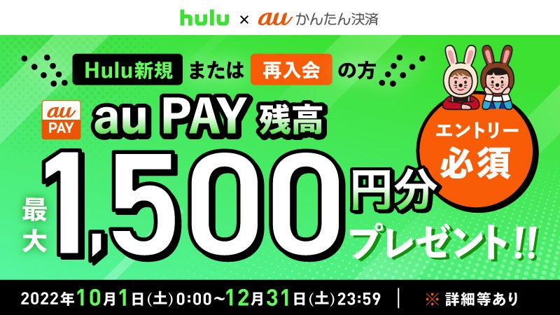 auかんたん決済のお支払いで、Huluに新規・再入会すると最大1,500円相当のauPAY残高チャージ還元する「Hulu × auかんたん決済キャンペーン」10月1日(土)から実施