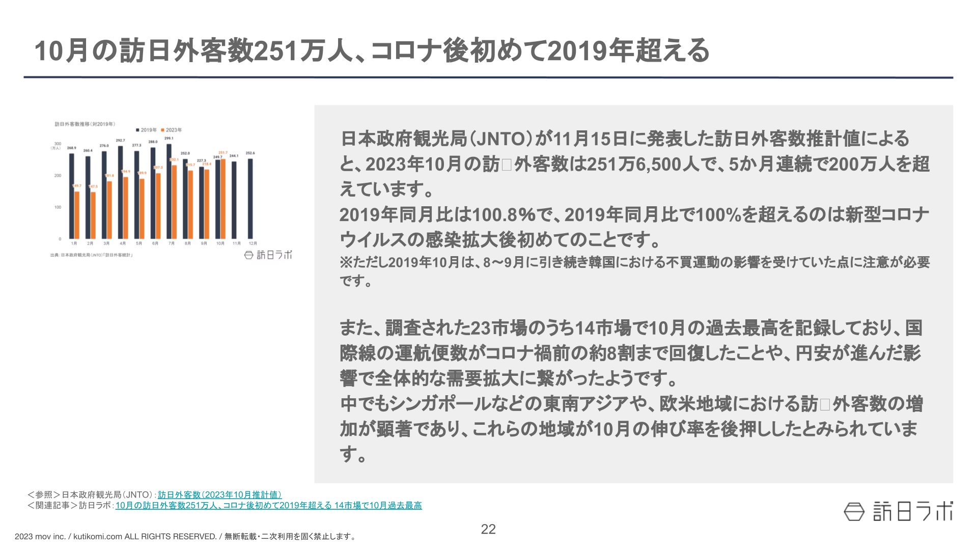 10月の訪日外客数251万人、コロナ後初めて2019年超える