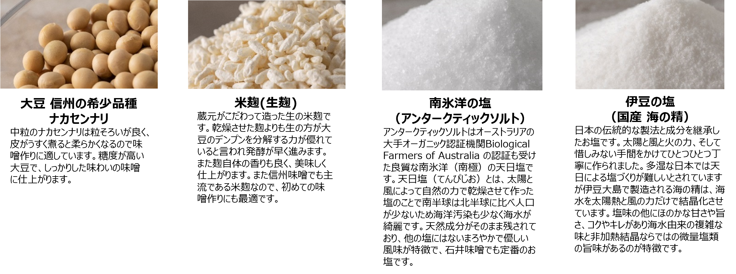 貝印の味噌作り体験セットはご家庭で味噌を仕込まれる方でも美味しくできるよう、塩辛さを抑えつつ、甘みが引き立つ配合比率に仕上げています。原材料となるのは大豆・麹・塩のたった3種類です。塩に含まれるミネラルバランスや旨味と甘味が異なる大豆の種類、そして米や麦などの麹の違いに加え、配合比率によって味噌の味わいは大きく変わってきます。蔵元 が厳選した原材料のほか、80蔵以上を探訪してきた岩木先生だから分かるこだわりの配合比率でお客様にお届けいたします。