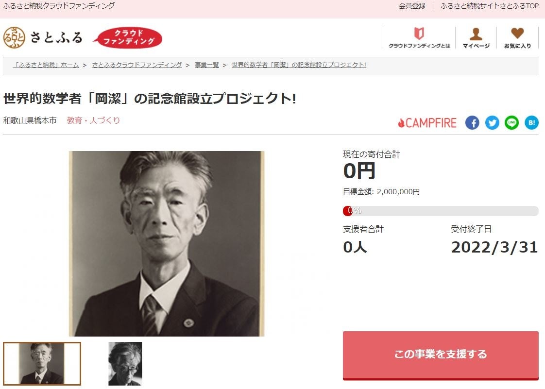 和歌山県橋本市とふるさと納税ポータルサイト「さとふる」(https://www.satofull.jp/)を運営する株式会社さとふる(本社:東京都中央区、代表取締役社長:藤井 宏明)は、寄付金の使途に応じて事業を立ち上げ寄付を募る「さとふるクラウドファンディング」(https://www.satofull.jp/projects/top.php)にて、橋本市名誉市民で世界的数学者である岡潔氏の功績を後世に伝える記念館設立のため、2022年2月1日より寄付受け付けを開始します。