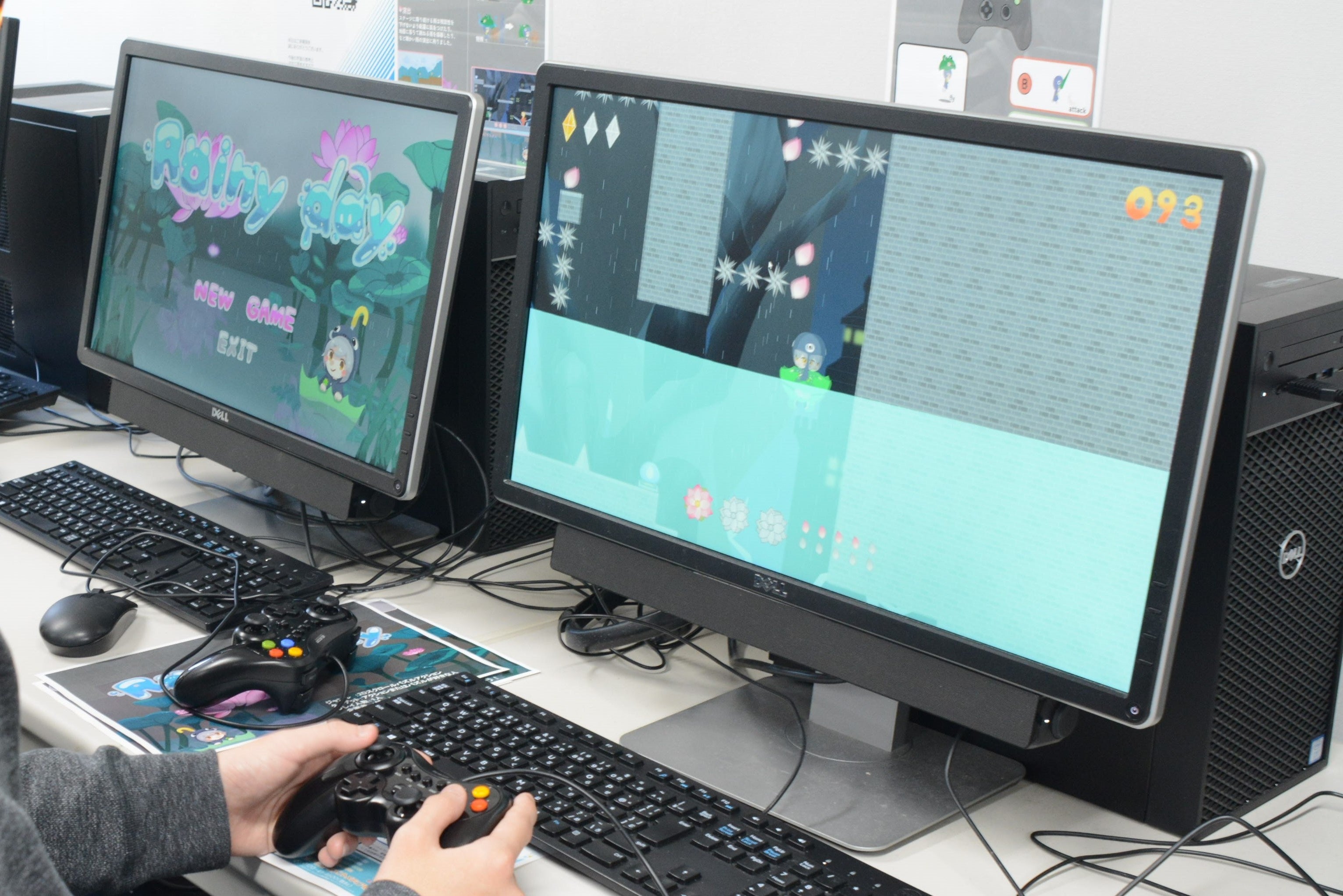 ゲーム系の3学科とキャラクターデザイン学科の学生でチームを組み、一つのゲームをつくり上げる共同制作。その作品を自由にプレイできるブースを設置していました。キャラクターの声は声優学科の学生が担当しています。中には、ゲームだけでなく、キーホルダーやアクリルスタンドなど、オリジナルグッズを作っているチームも。さらに別の教室では、企業の方をお招きし、1年生が初めて本格的に開発したゲーム作品の講評会を行いました。