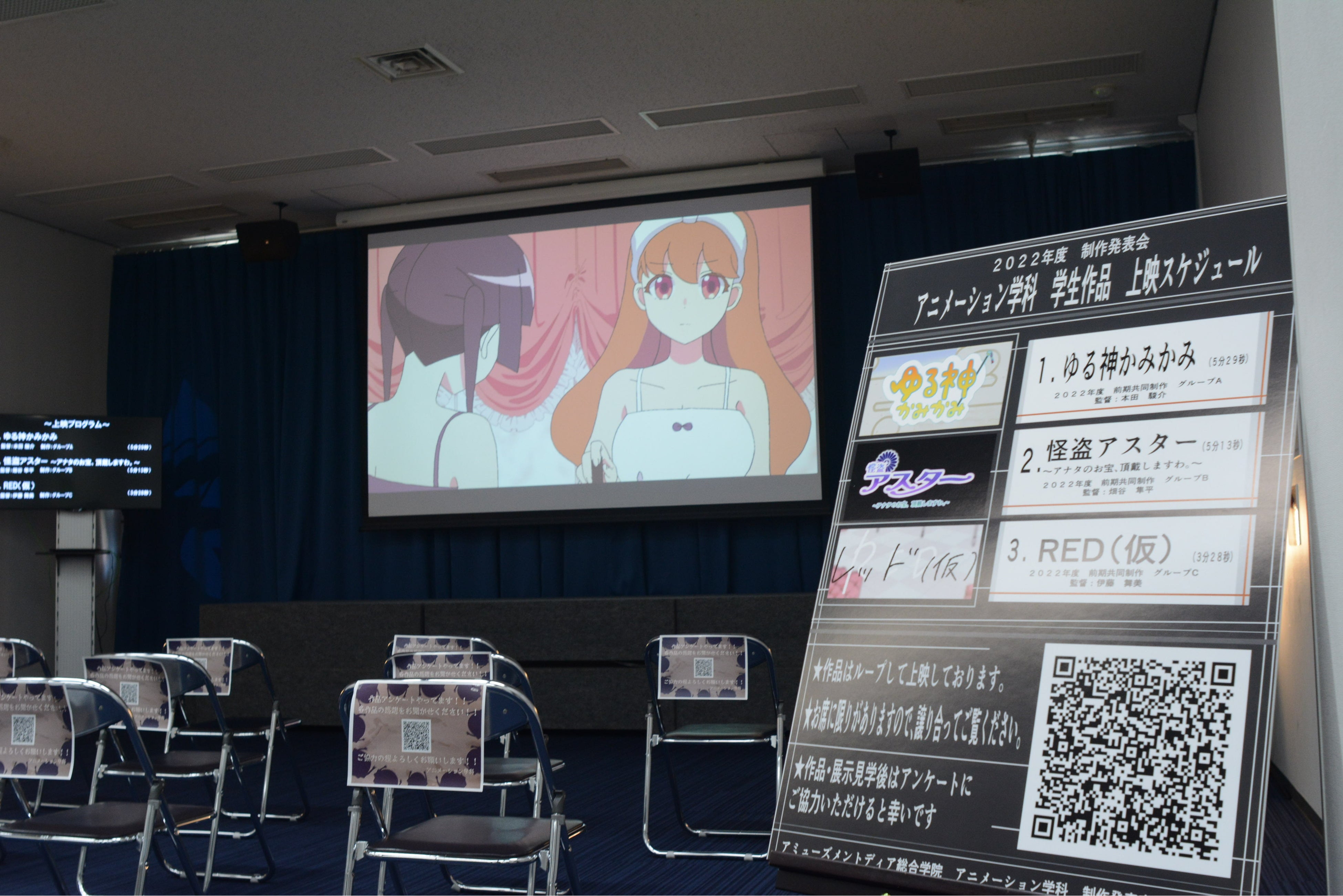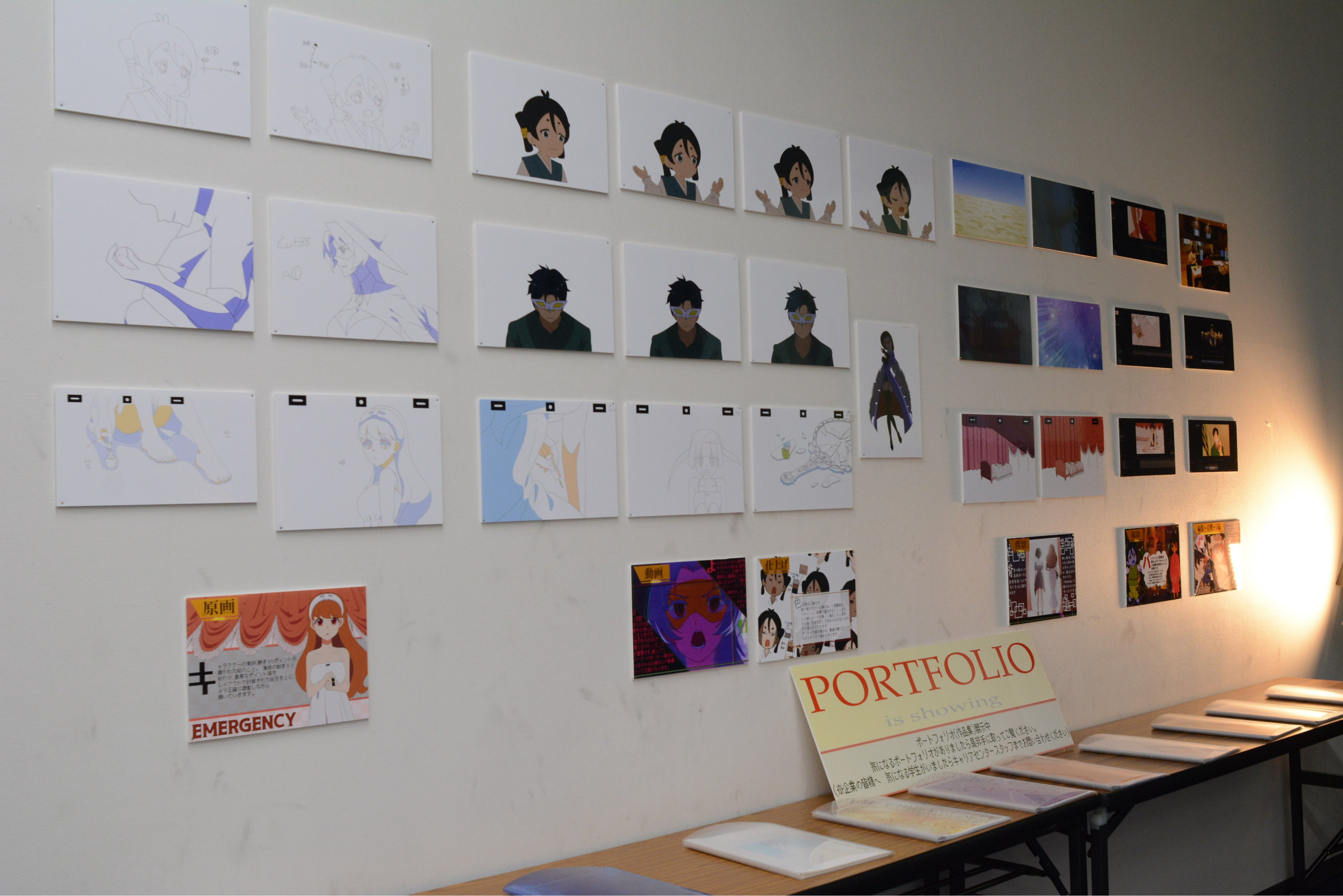 1年生が入学して最初に作ったアニメーション作品をスクリーンで上映。先日、アニメ共同制作発表会にて、講師の先生や企業の方々から講評をいただいたばかりの作品です。壁には、アニメの原画なども展示されていました。