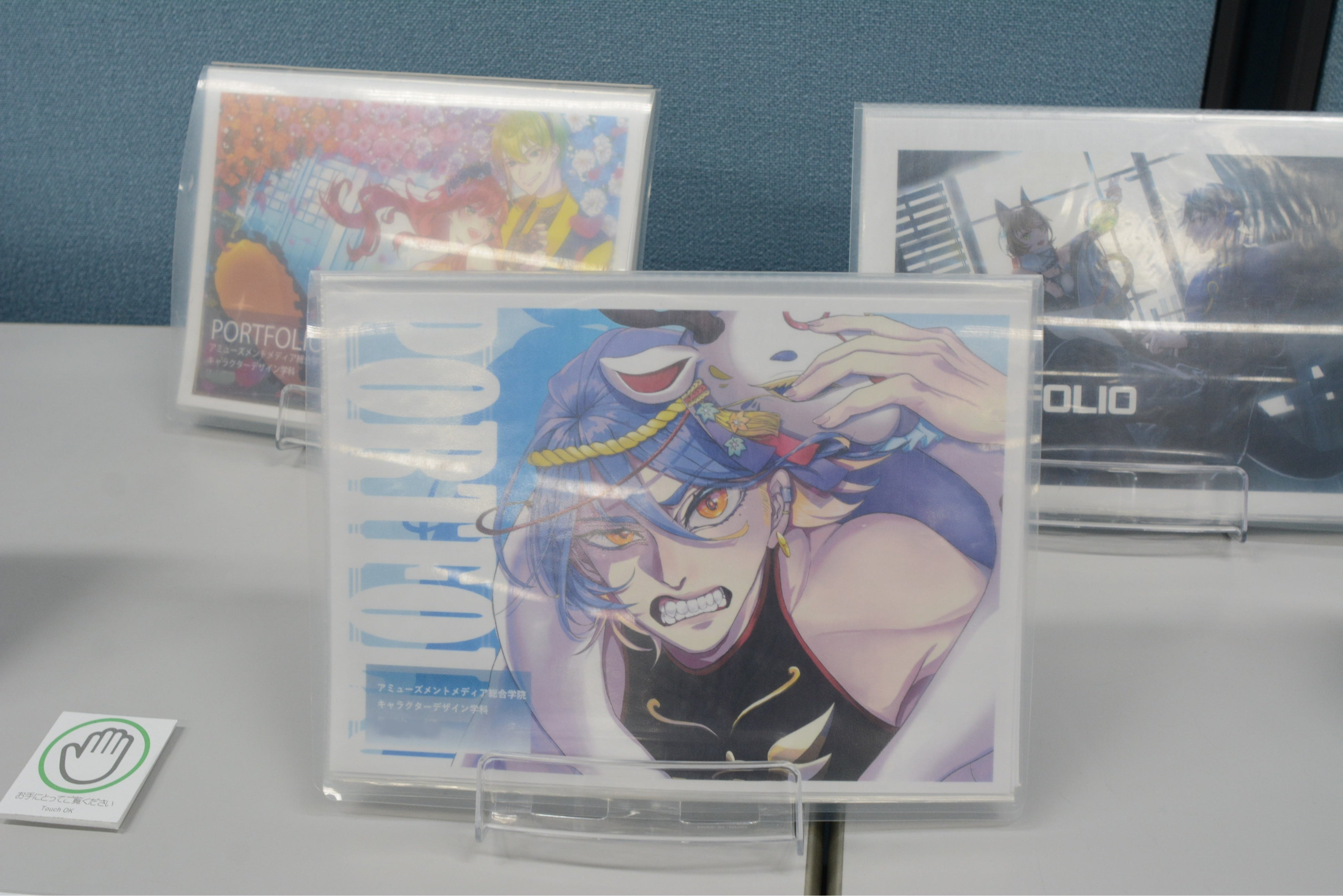 キャラクターデザイン学科の今年のイラスト制作のテーマは「異世界ジョブ」。ポートフォリオは、ゲーム業界希望者やグッズ業界希望者など、将来目指す職種ごとに並べられており、来場者の方からは「どれもどれも見応えのあるものばかりでした」という感想をいただきました。