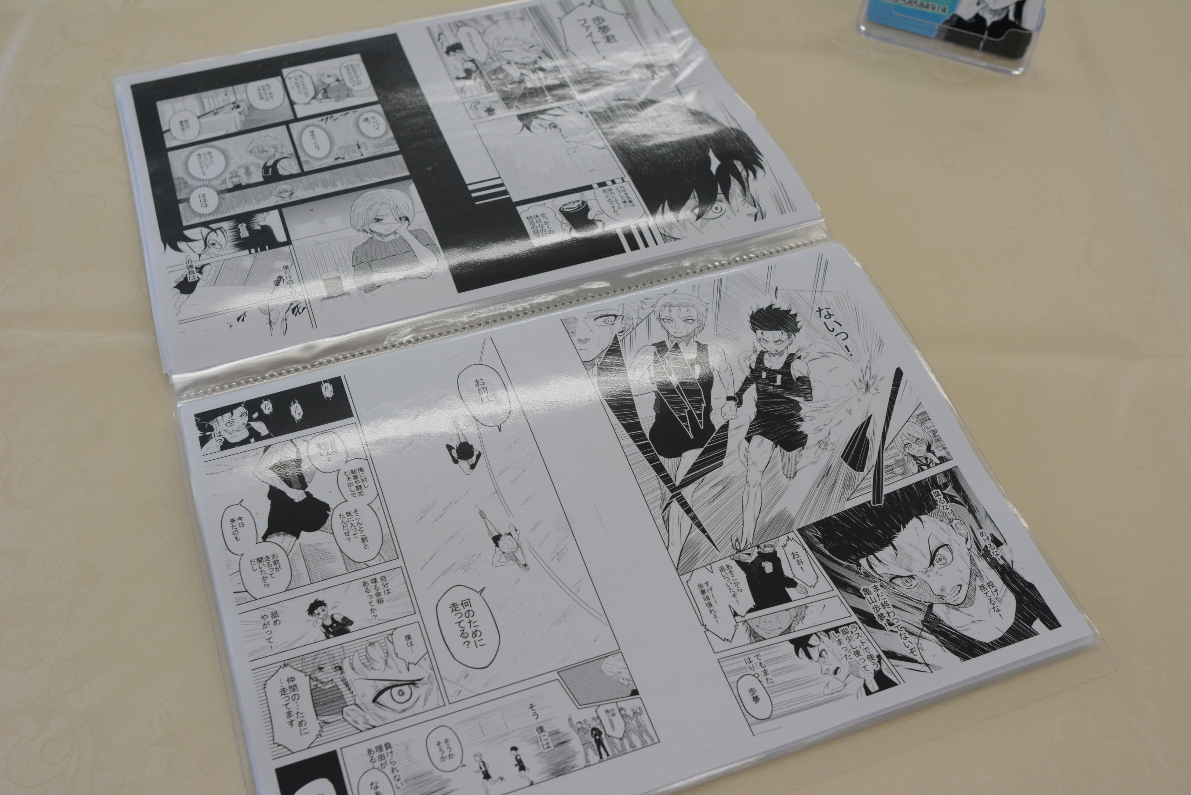 1、2年生のポートフォリオを展示。学生一人ひとりが個性に満ちた作品を手掛けており、可愛いキャラクターの絵やインパクト抜群のタイトル、感動するストーリーなど、たくさんの工夫が施されていました。椅子に座ってじっくりと読んでいる参加者の方も。また、ポートフォリオの前には、授業の中でつくったばかりの名刺も置いてありました。自由に持って帰ることができるため、イベント終了後には机の上に1枚も名刺が残っていないという学生も多く見受けられるほど、本格的な名刺に仕上がっていました。