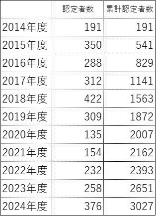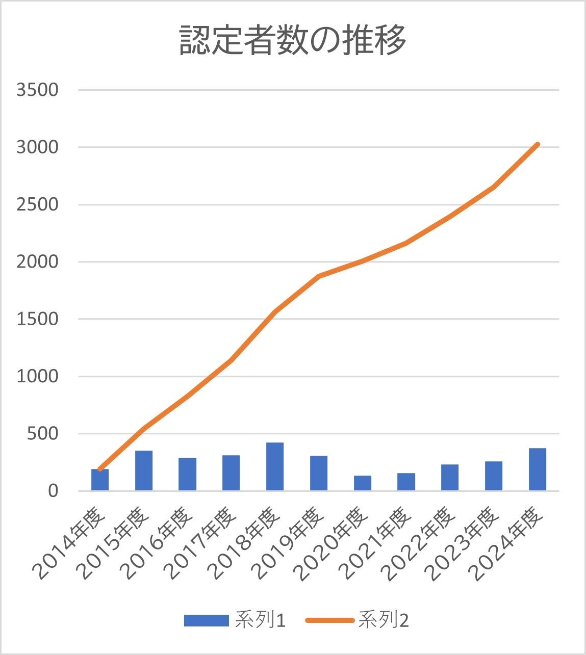 2020年以降のコロナ禍は当協会の認定研修も自粛せざるを得ない状況と なり、2019年度の309名の認定数に対し、2020年度は135名、2021年度は154名と例年の半分程度に落ち込みました。2023年5月8日に新型コロナが5類に移行し、一般的には日常生活が以前のように戻りつつありましたが、介護業界においては慎重にならざるを得ない状況が長く続きました。当協会では5類に移行後も非常事態宣言下に実施していた感染を最小限にとどめる衛生面の施策を徹底して、可能な範囲で高齢者との「話す」「触れる」活動に注力し、高齢者がいくつになっても自分らしくあるための活動を継続して実施してきました。2022年度には232名、2023年度には258名と復調の兆しは見えたもののかなり緩やかな復調にとどまりました。2024年度は376名の認定となり、2018年度の422名に次ぐ認定者を輩出することができました。