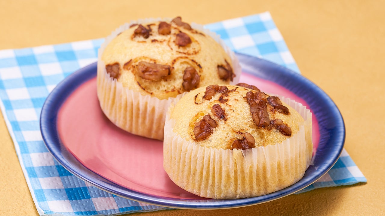 フルーティなバナナの蒸しパンはモチモチとした食感が特長。その上にトッピングしたカリっと食感の香ばしいくるみが食感のアクセントになっています。2個入りです。