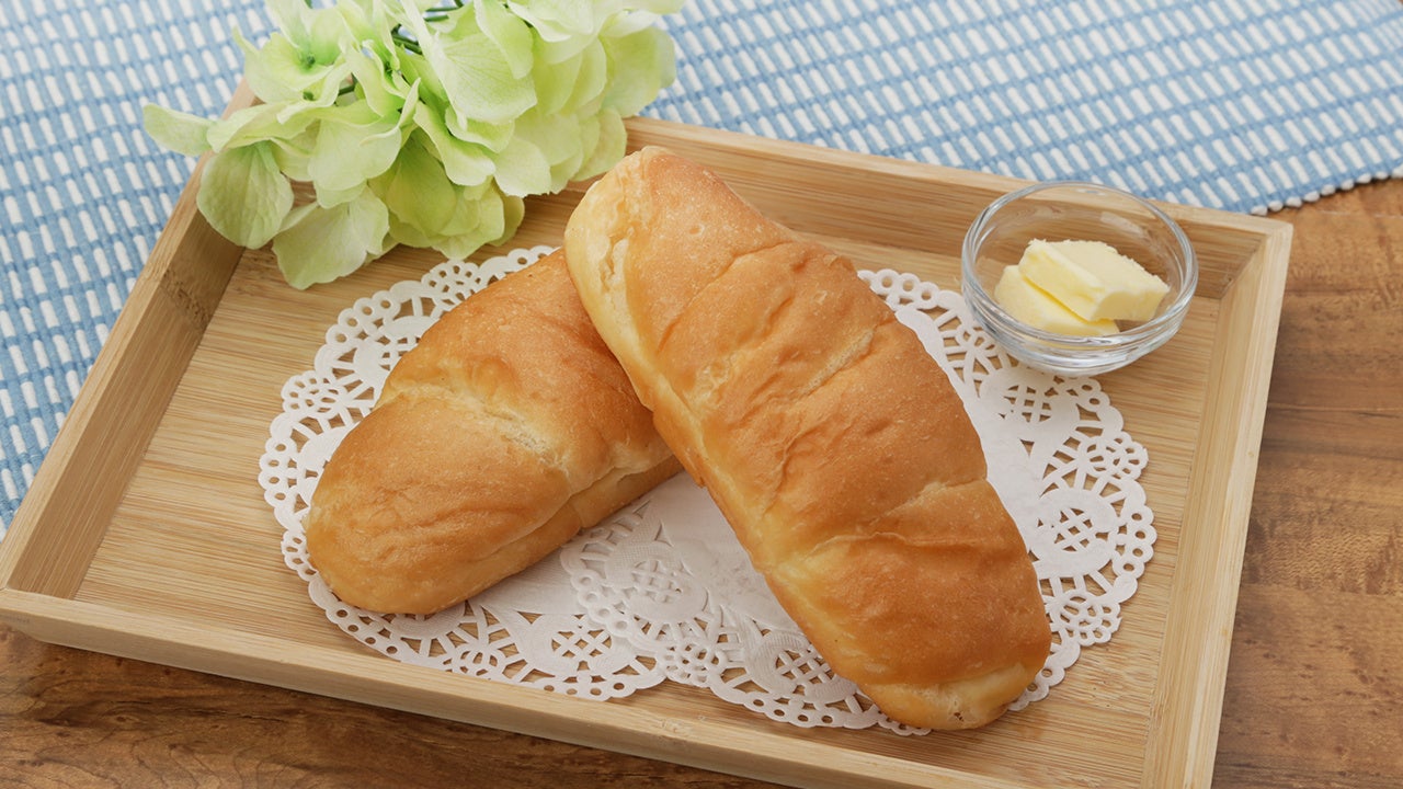 ソフトな食感のフランスパンに、バター入りのマーガリンを包んで焼き上げたた塩パンです。バター入りマーガリンが生地にたっぷりしみ込んでいます。バターの香りがじゅわっと口の中に広がる商品です。