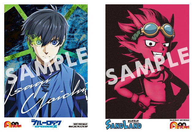 『ブルーロック』は劇場公開中『劇場版ブルーロック -EPISODE 凪-』のエゴイストビジュアルを使用したミニブロマイド(全7種ランダム・『ブルーロック』関連商品3,000円(税込)ご購入ごとに1枚お渡し)、『SAND LAND』は新規イラストを使用したL版ブロマイド(全1種・『SAND LAND』関連商品3,000円(税込)ご購入ごとに1会計1枚お渡し)です。