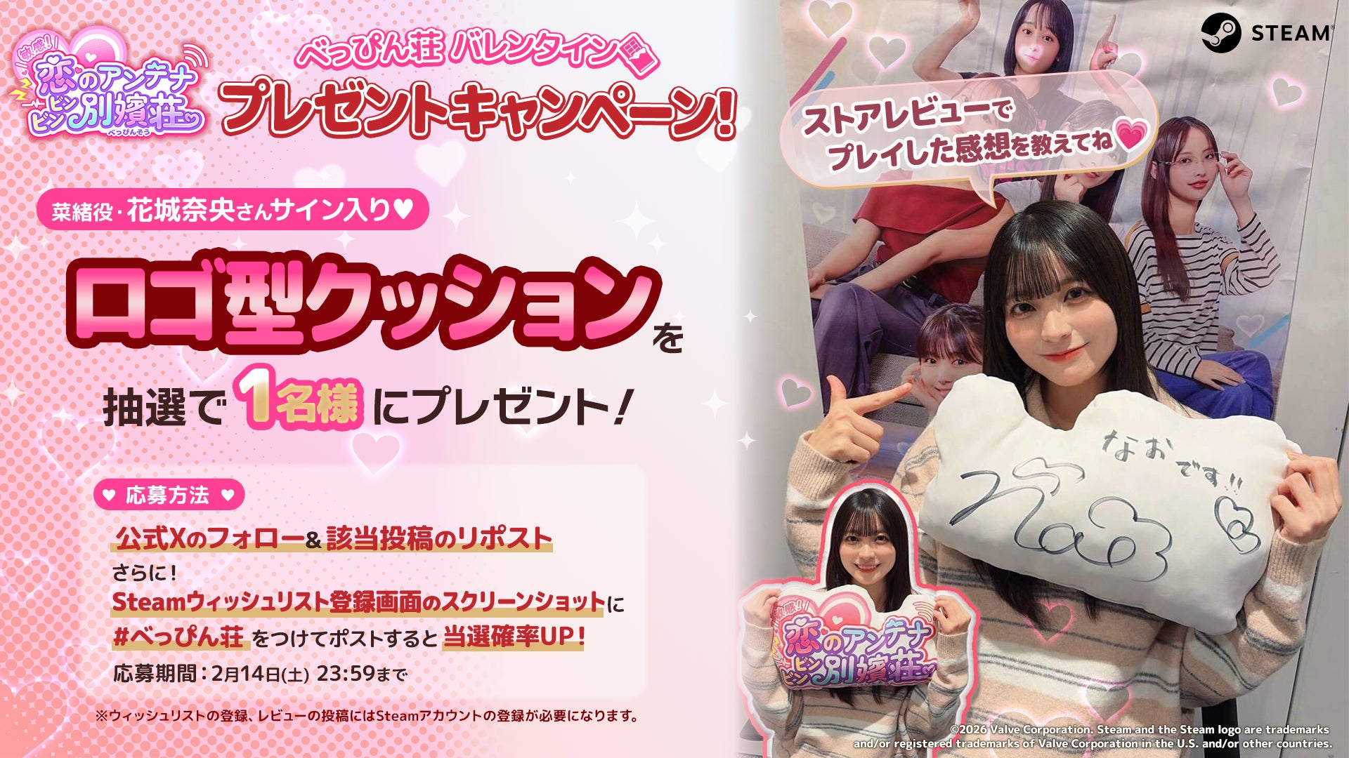 べっぴん荘公式X(https://x.com/antena_binbin)にて菜緒役、花城奈央さんのサイン入りクッションを抽選で1名様にプレゼントするキャンペーンを開催しております。ぜひ公式Xのフォロー&RP、ウィッシュリスト登録とレビューを投稿してキャンペーンにご参加ください。
