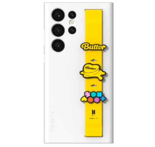 「Galaxy S23 Silicone Grip Case」、「Galaxy S23 Ultra Silicone Grip Case」の背面に付け替えが可能なストラップです。BTSのButterをモチーフとしたデザインが施された柔らかな質感のストラップにより、スマートフォンを手に固定させることで、片手でも安心してスマートフォンの操作が可能です。