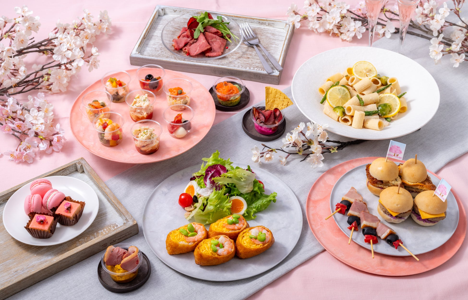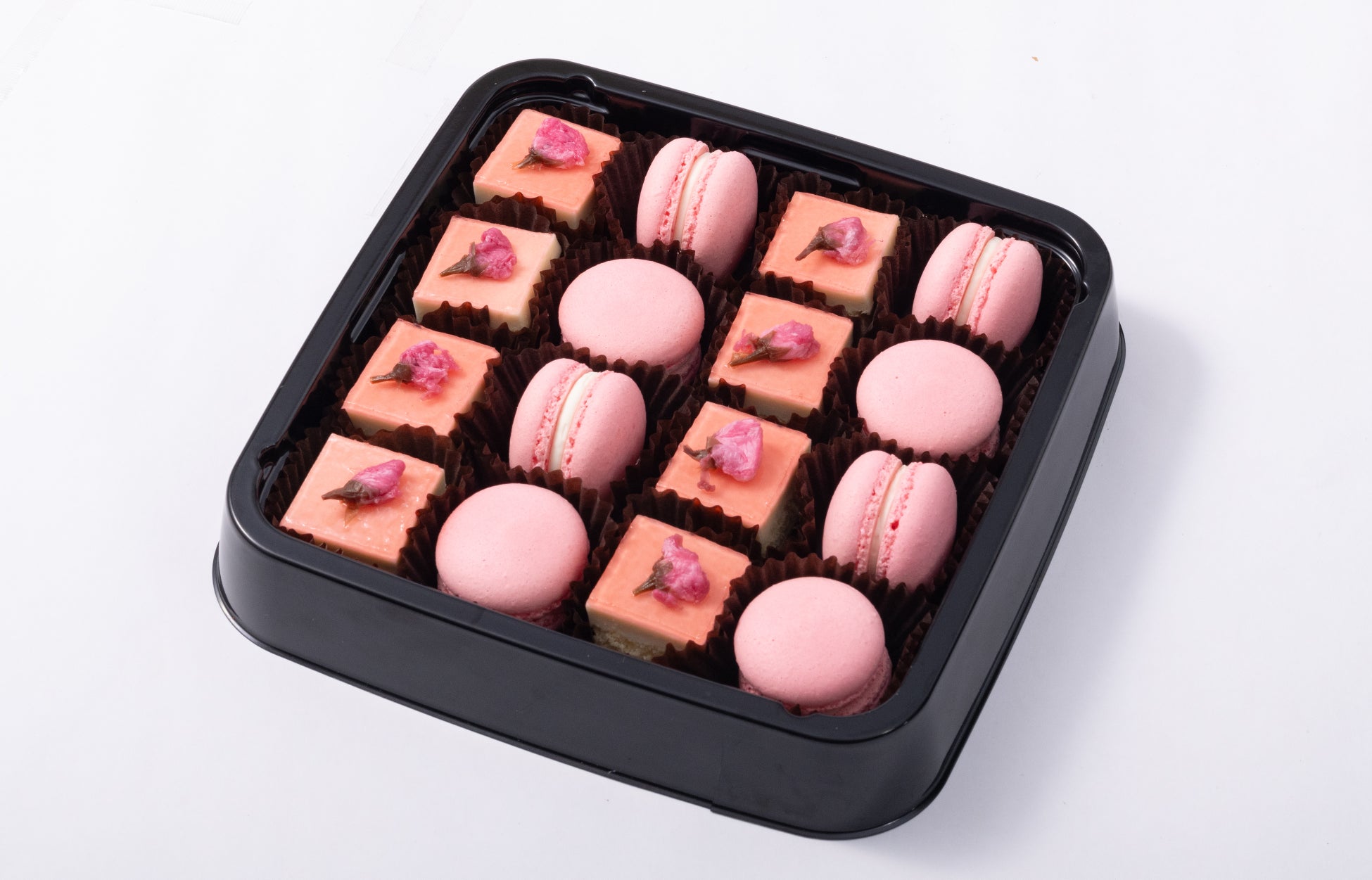 お花見プランでは、桜の花や木を感じていただける彩り豊かな商品をご用意しました。中でも、ピンクのスクエア型フィンガーケーキとマカロンが特徴です。フィンガーケーキには桜の塩漬けを乗せているため、ひと口召し上がると桜の香りがふわりと広がります。マカロンも桜の風味を感じられる味わいに仕上げており、オフィスでもお花見気分をお楽しみいただけます。