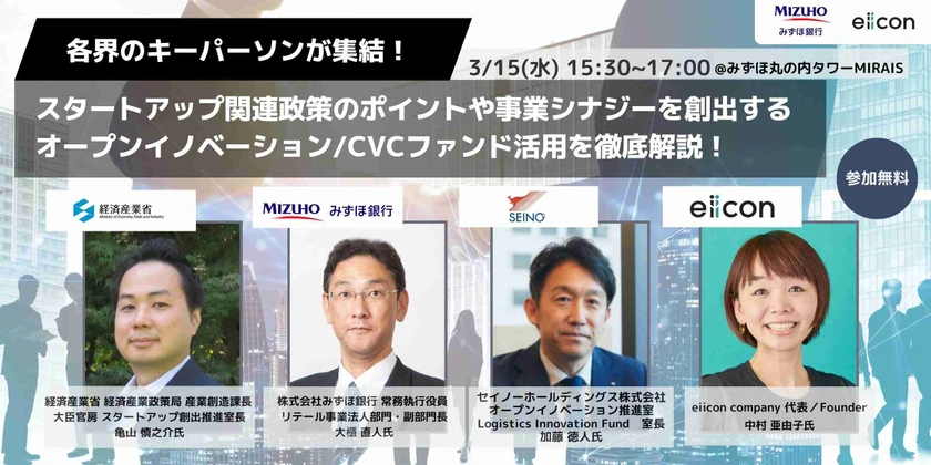 【みずほ銀行×eiicon company コラボ】3月15日(水)「スタートアップ関連政策のポイント」「事業シナジーを創出するオープンイノベーション/CVCファンド活用」無料特別セミナーのお知らせ。