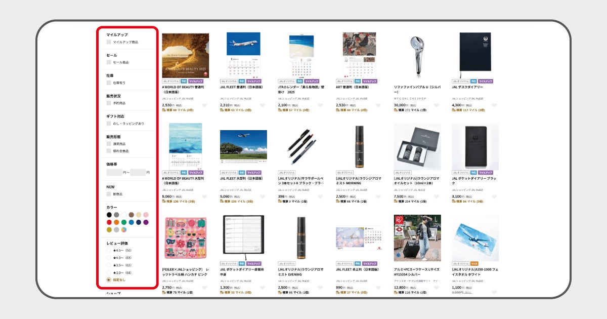 「価格帯」「レビュー評価」「ギフト対応」のほか、航空会社ならではの「マイルアップ」など複数項目を組み合わせた絞り込み検索を実装したことで、ユーザーが希望に近い商品を見つけやすくなるようサポートしUX向上に貢献しています。