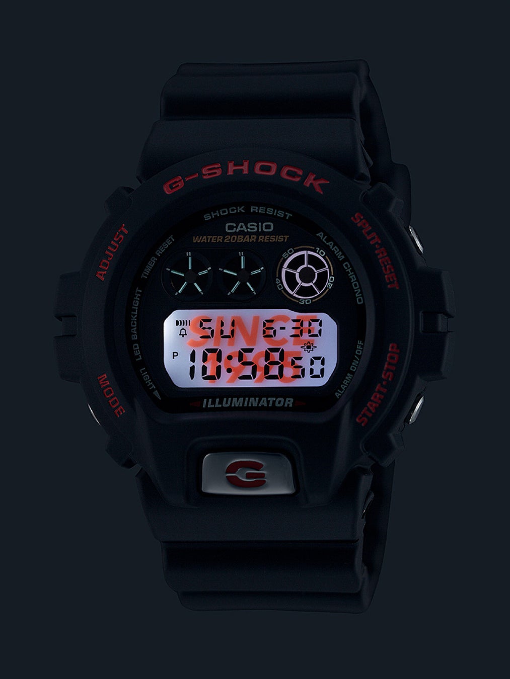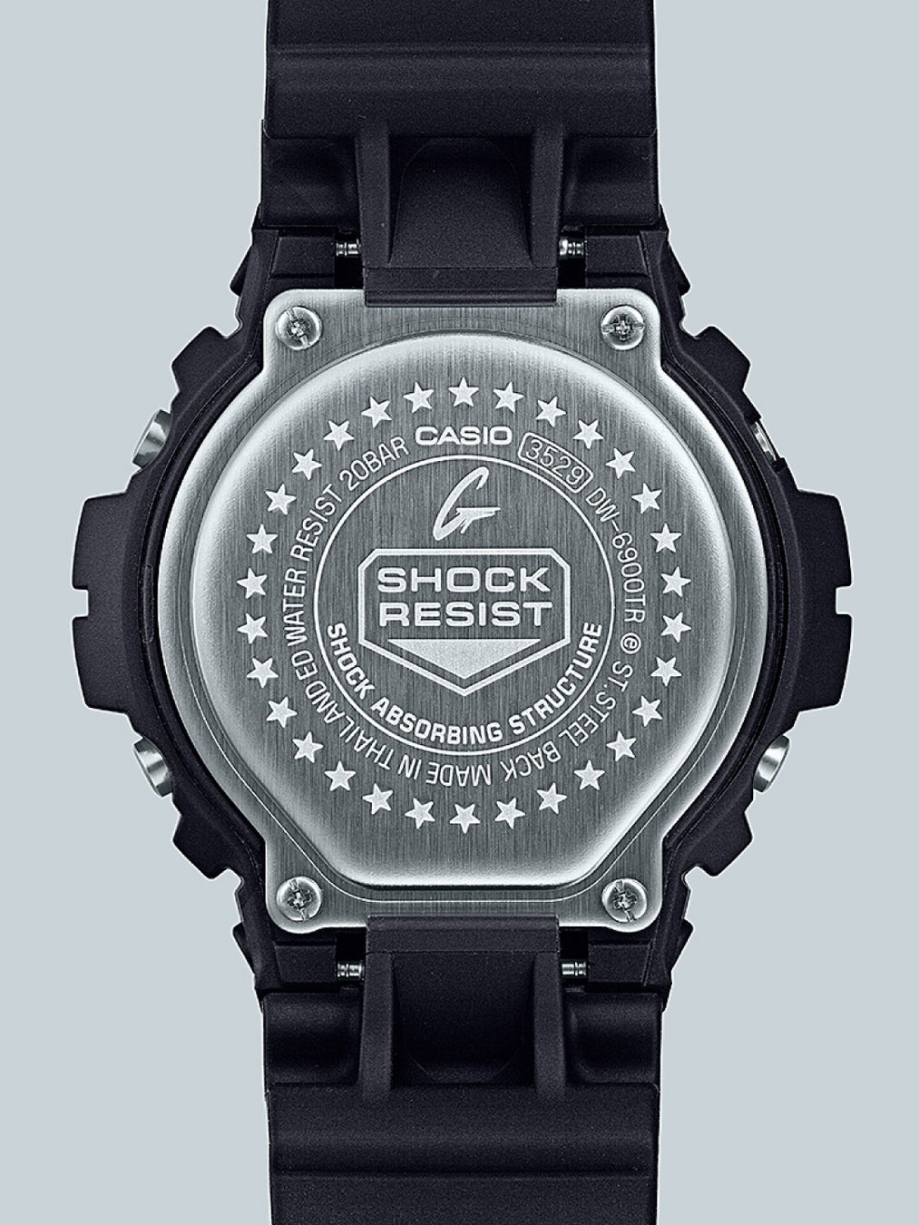 今回ご案内します『DW-6900TR』は、「DW-6900」の誕生30周年を記念し、同シリーズ初のカラーバリエーションモデル「DW-6900H」の色合いを再現した耐衝撃ウオッチです。カラーは「DW-6900H」に使用されたブラック、レッド、イエローの3つをラインアップ。時代を超えて90年代の懐かしさを感じるカラーを再現しました。バックライト点灯時には「SINCE 1995」の文字が液晶に浮かび上がるほか、裏蓋にスターマークを30個レイアウトするなど、周年モデルならではの特別感を演出します。