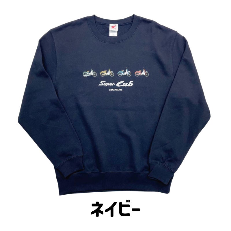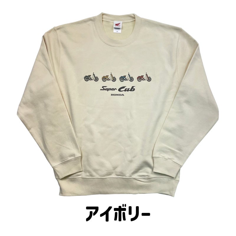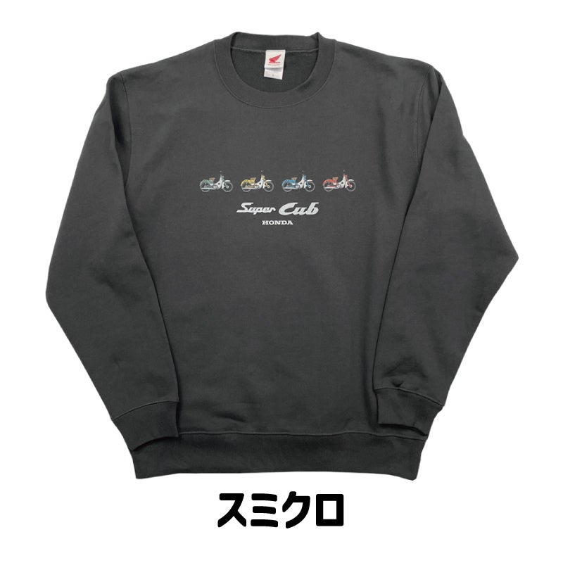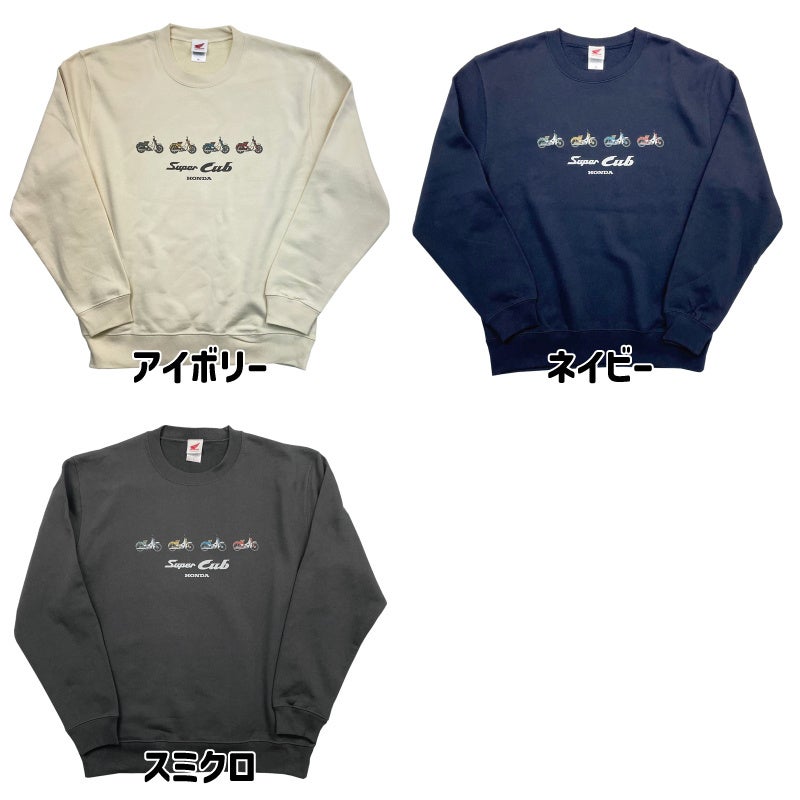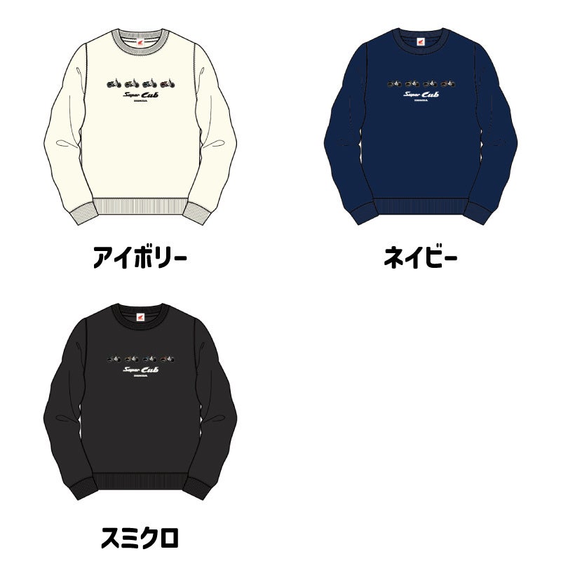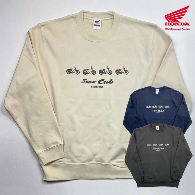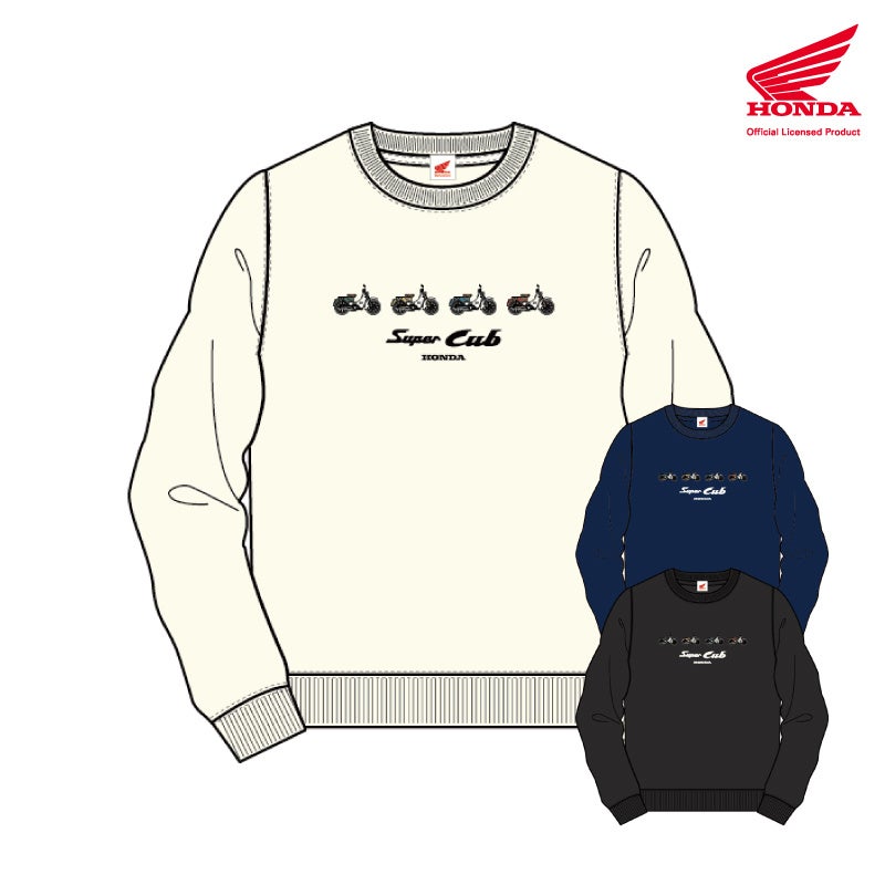 スーパーカブの横向きのイラストが並ぶ、遊び心たっぷりのデザインのスウェットウェアが発売となりました。