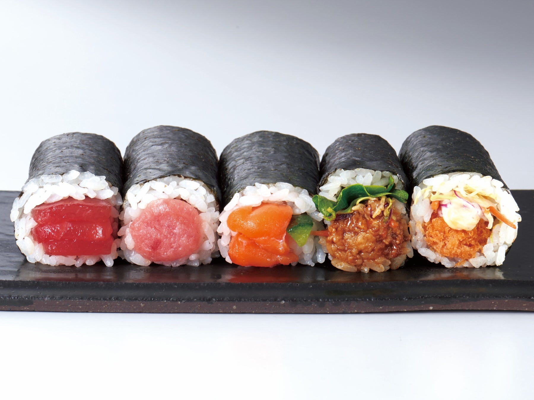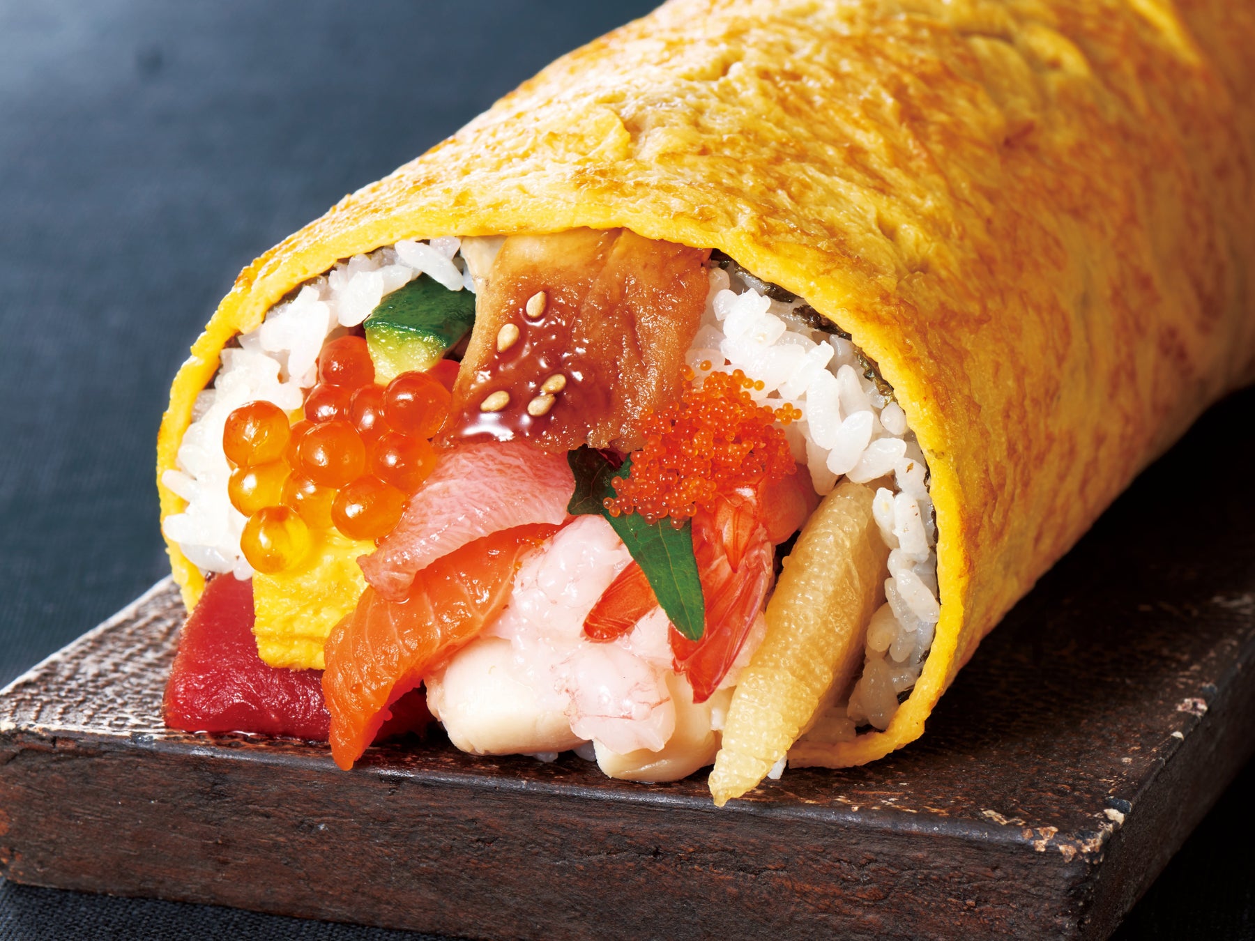 「めばちまぐろ赤身」、「サーモン」、「えび」の人気具材に加え、食感が楽しめる「数の子」、「きゅうり」、「大葉」を盛り込んだ王道の海鮮太巻です。具材のカットサイズや鮮度にもこだわっています。