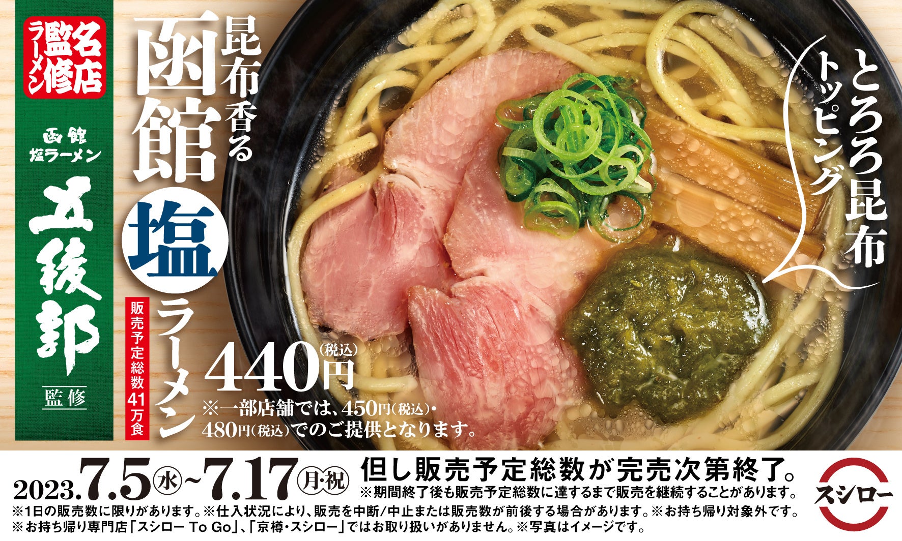 東京都荻窪にあり、塩ラーメンの名店として名高い「五稜郭」監修。「昆布香る函館塩ラーメン」が期間限定で登場!!<7月5日(水)より全国のスシローにて販売開始>