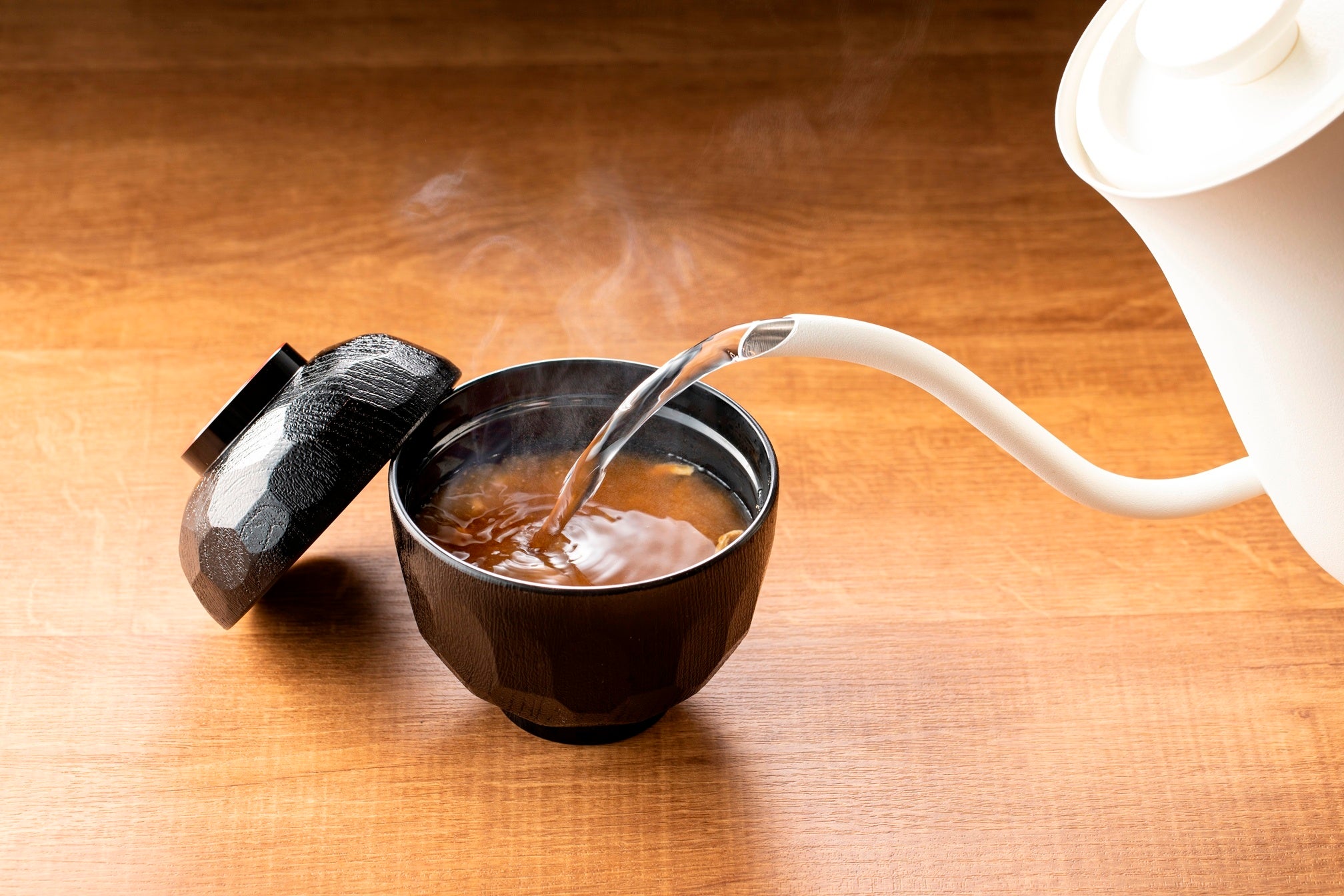 温め方:ご飯や主菜は客室の電子レンジで加熱。味噌汁は客室のポットでお湯を注ぎます。