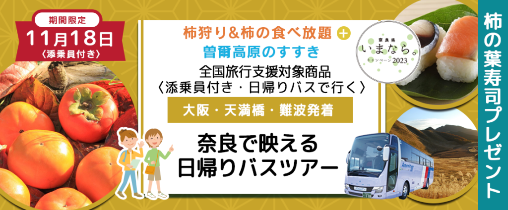 おひとり様¥6,000- 11月18日(土) 【奈良県】〈大阪駅・天満橋・なんば発着・添乗員付き〉《柿の葉寿司プレゼント》 柿狩り&柿の食べ放題+曽爾高原のすすき 奈良で映える日帰りバスツアーのオンライン販売を開始しました。
