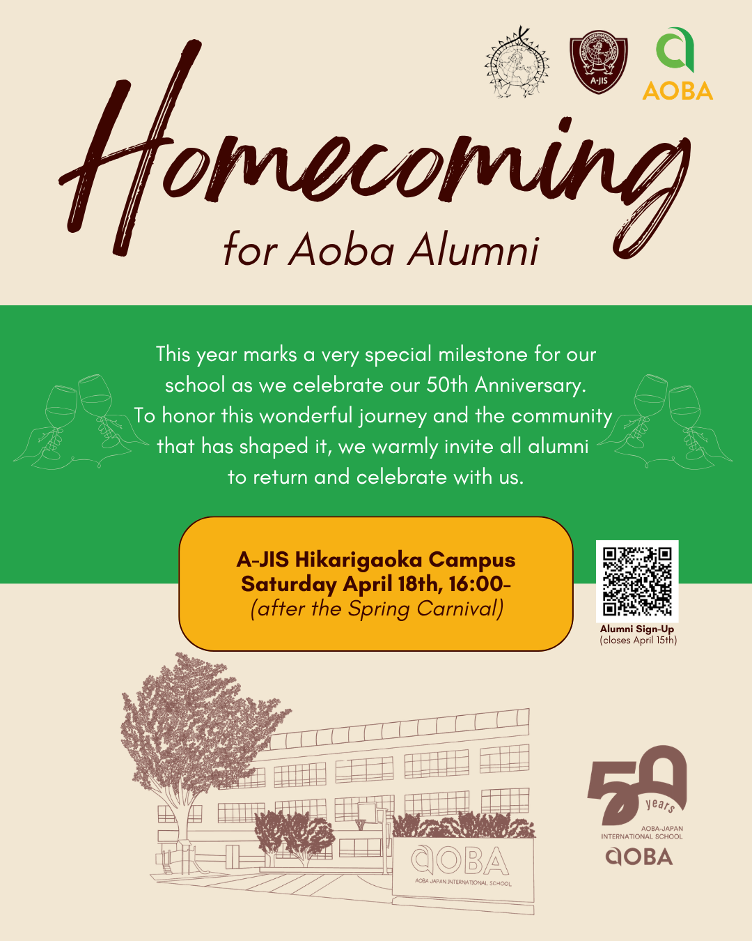 2026年4月18日(土)スプリングカーニバル開催後に光が丘キャンパスにて、卒業生・在校生・教職員を招いた「50th Anniversary Homecoming Celebration」を開催します。半世紀の歴史を支えてきたコミュニティが一堂に会し、世代を超えた交流を図る場とします。