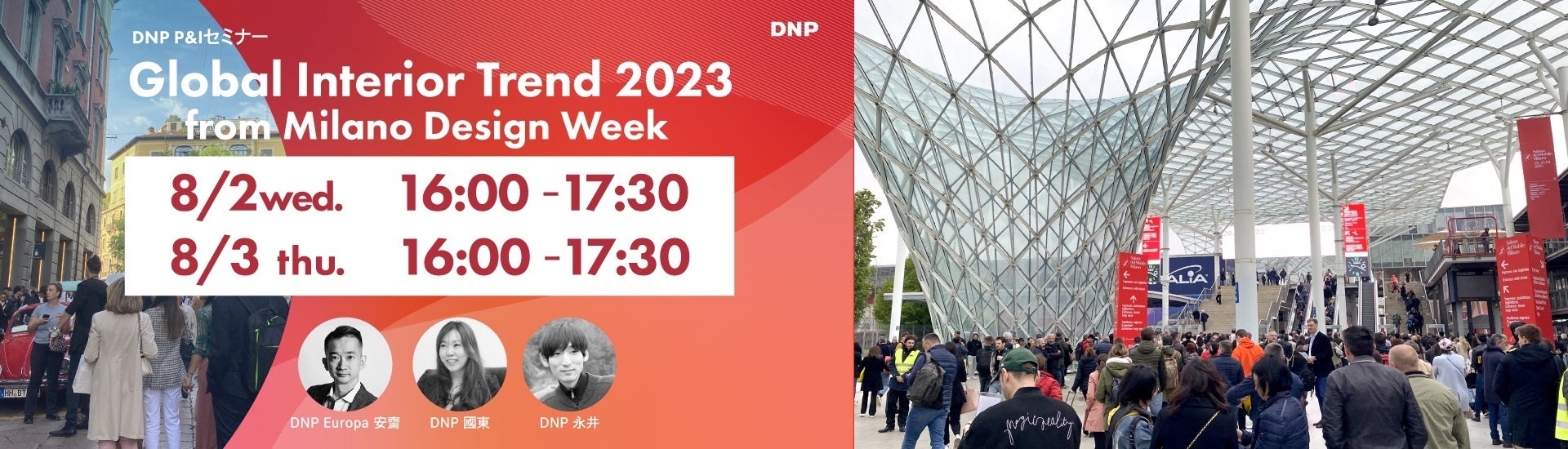 DNPは20年以上にわたり、世界最大級のインテリア・デザインイベント「ミラノデザインウィーク」を調査しています。今回のセミナーでは、この調査の中で100社を超えるインテリアブランドに行った取材に基づき、DNP独自の視点で分析したトレンドや、インテリア・コーディネートにおける素材・カラーのポイントなどを紹介します。また、今年5月にロンドンで開催された「Clerkenwell Design Week 2023」など、ミラノデザインウィーク以外の海外展示会についての速報も紹介する予定です。
