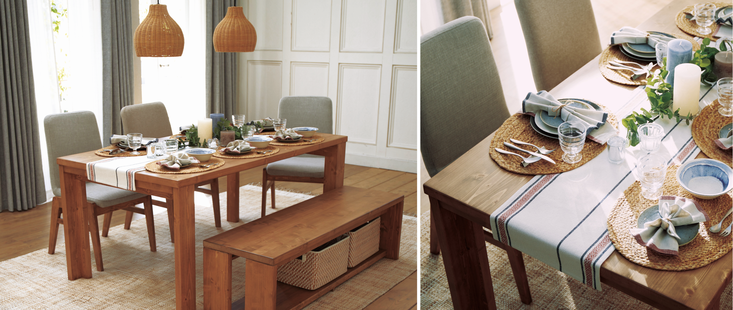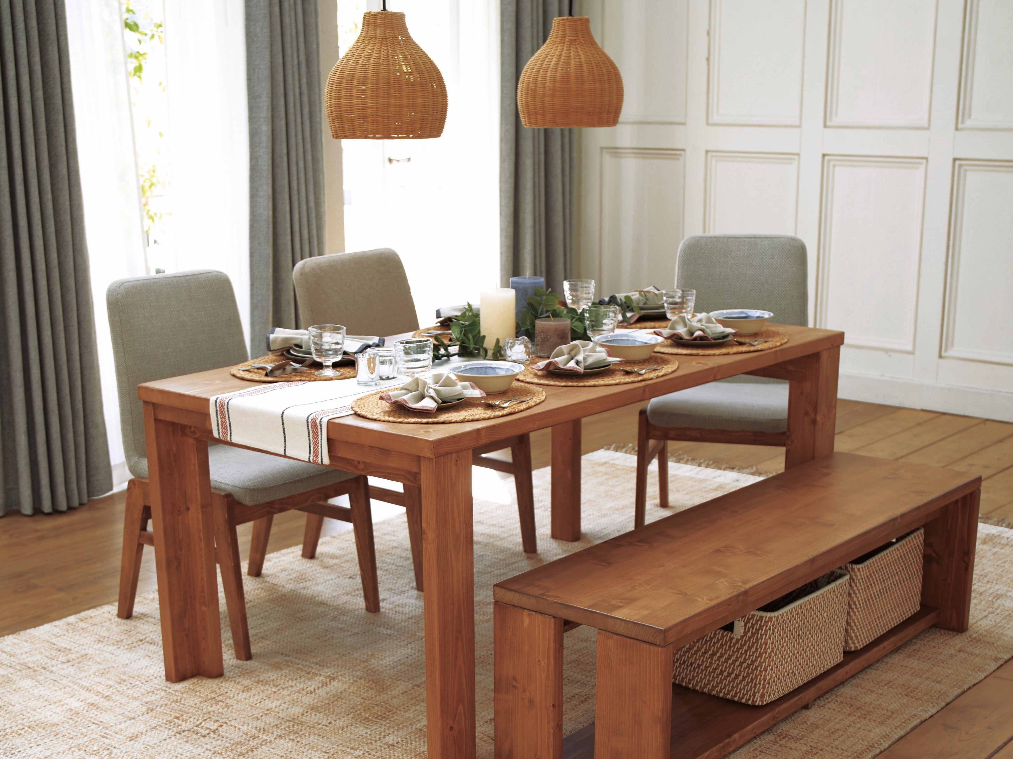 天然木パイン無垢材を贅沢に使ったテーブル。やわらかな木肌とやさしい木目が、ダイニングをあたたかな雰囲気に。