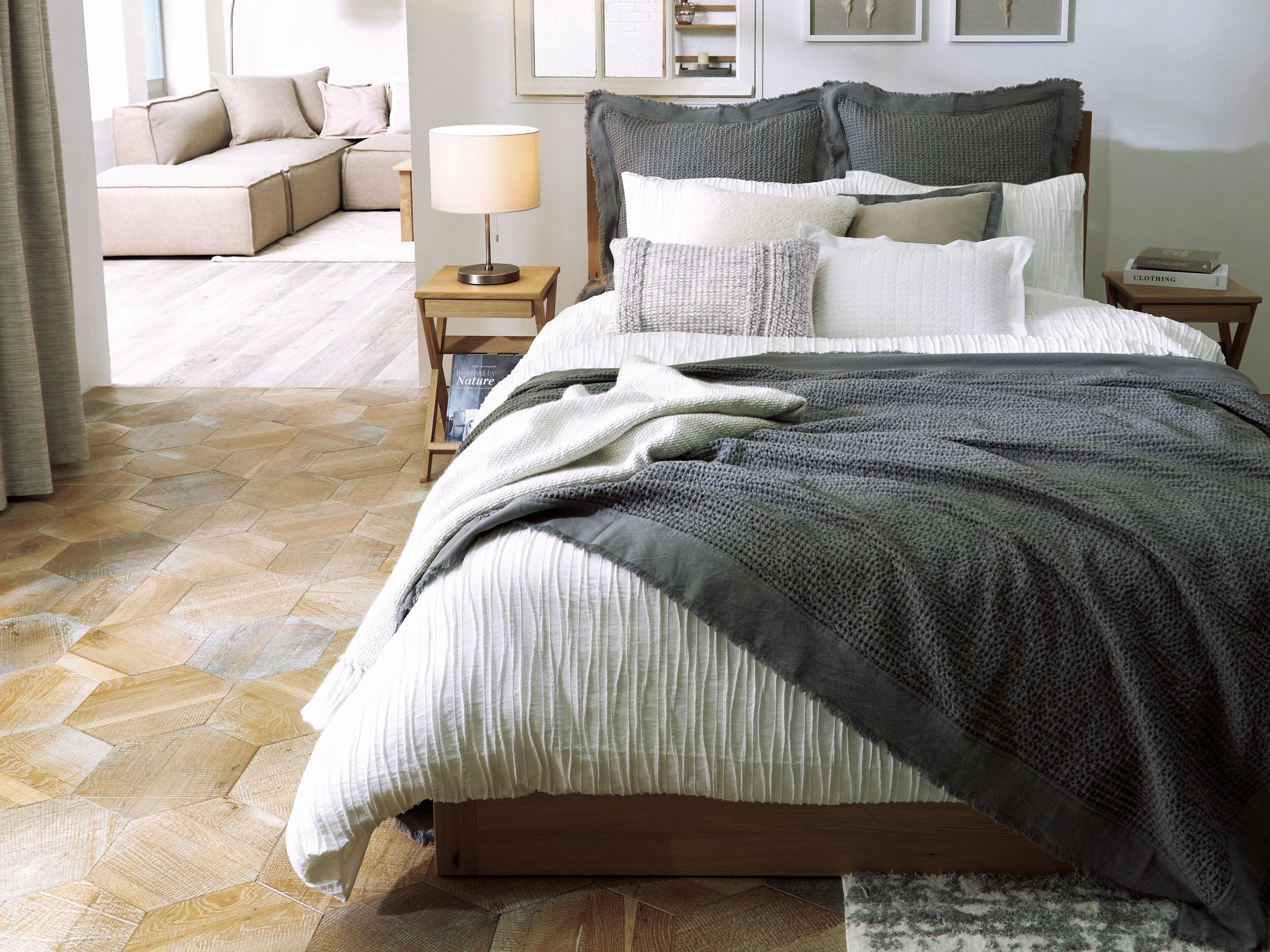 「Living in Comfort」の特長は何と言っても、一つひとつのアイテムの素材。オークやパインといった天然木や本革、ラタンやコットン・リネンなどの自然素材は、風合い豊かで上質な雰囲気があり、経年変化を楽しみながら長く使えると好評です。