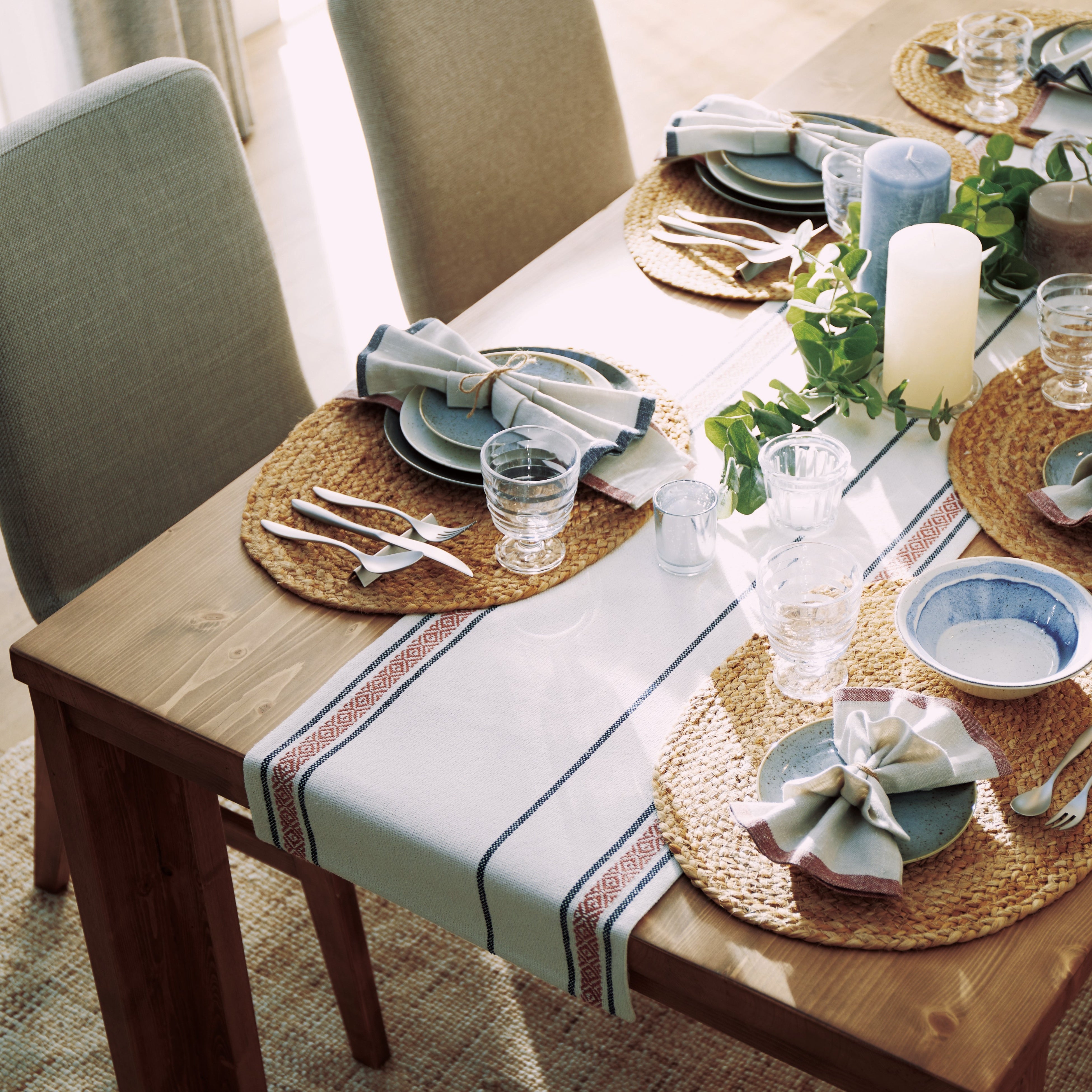 コットンのやわらかな風合いを、リラックスタイムの相棒に。植物モチーフの幾何柄がリビングやベッドルームのアクセントに。