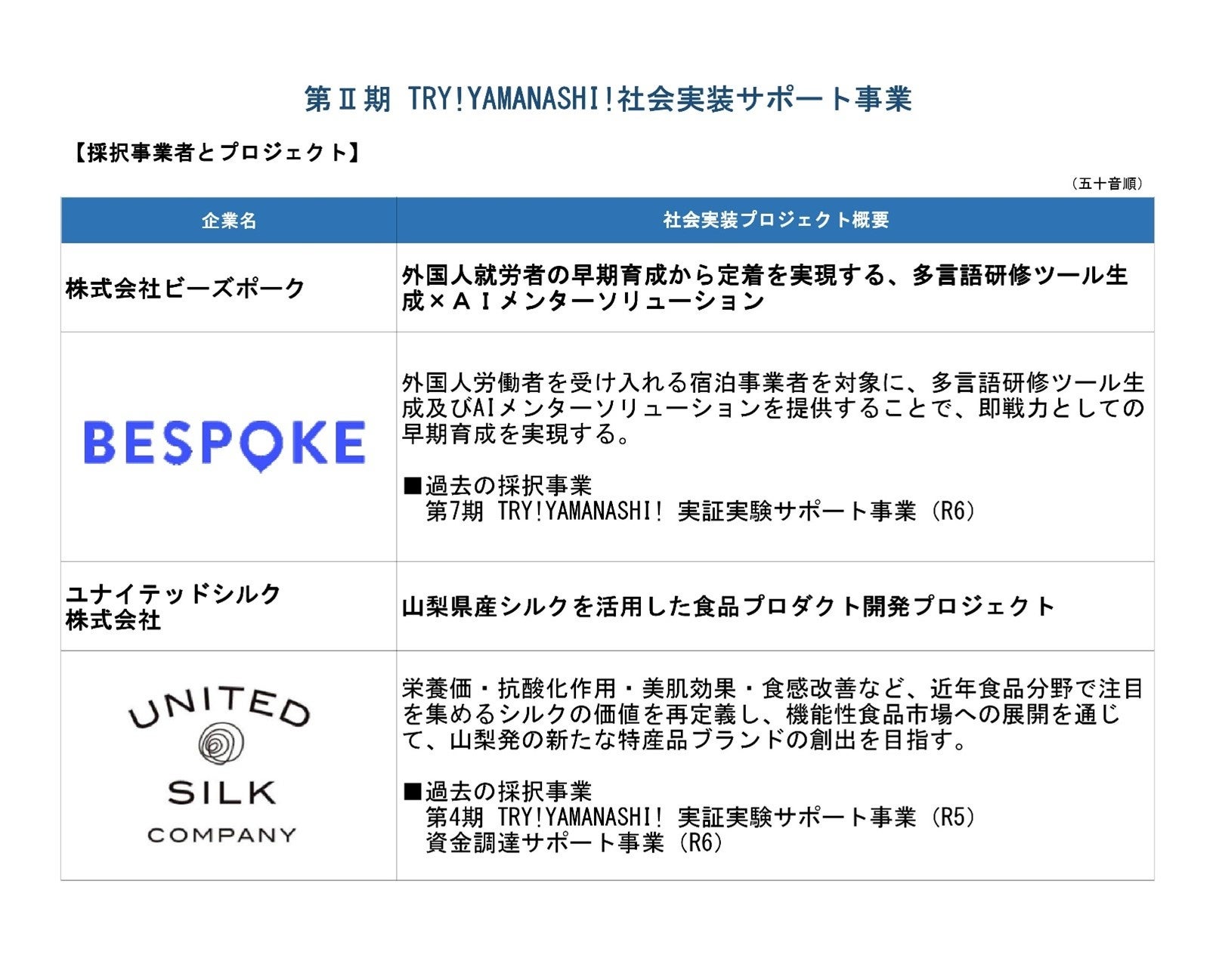山梨県(知事:長崎幸太郎)は、スタートアップ等による先端技術・サービスの社会実装を支援する「TRY!YAMANASHI!社会実装サポート事業」の第Ⅱ期において、令和7年9月24日に実施した二次審査の結果、以下の2社を採択しました。