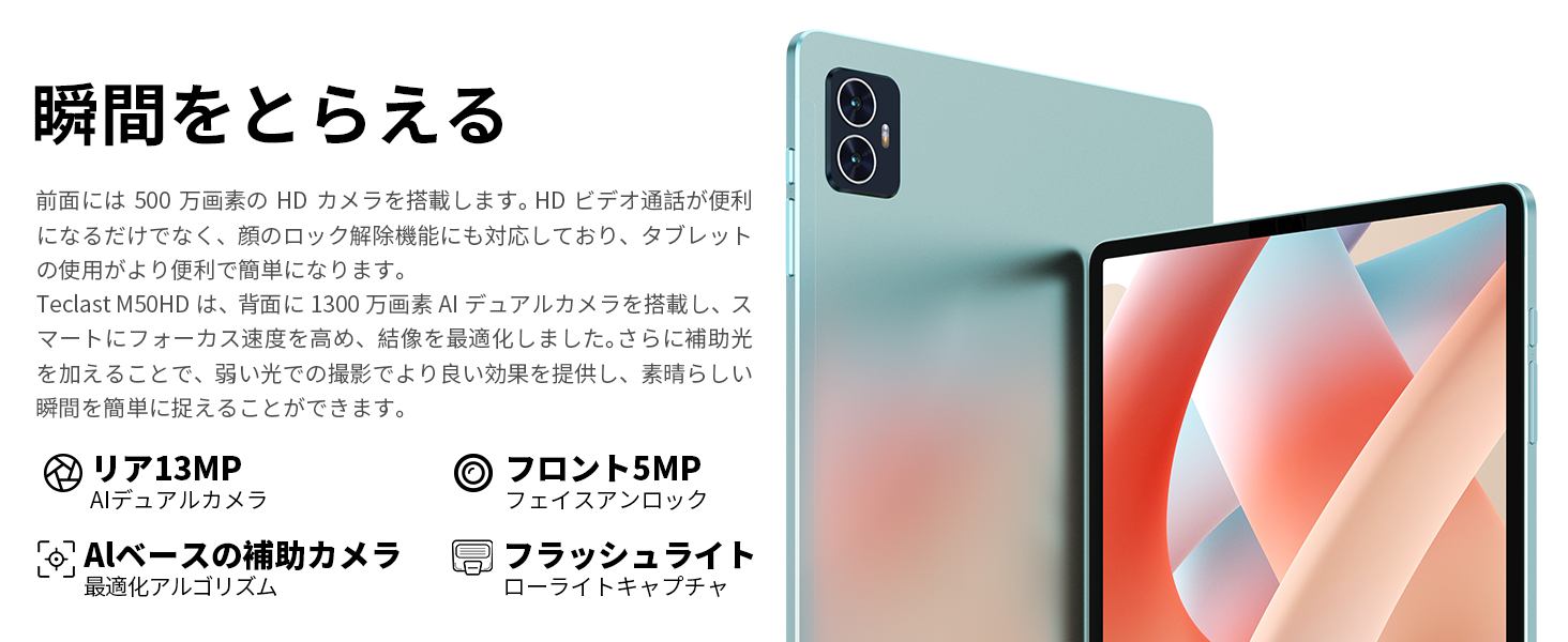 前面には500万画素のHDカメラを搭載します。HDビデオ通話が便利になるだけでなく、顔のロック解除機能にも対応しており、タブレットの使用がより便利で簡単になります。背面に1300万画素AIデュアルカメラを搭載し、スマートにフォーカス速度を高め、結像を最適化しました。さらに補助光を加えることで、弱い光での撮影でより良い効果を提供し、素晴らしい瞬間を簡単に捉えることができます。