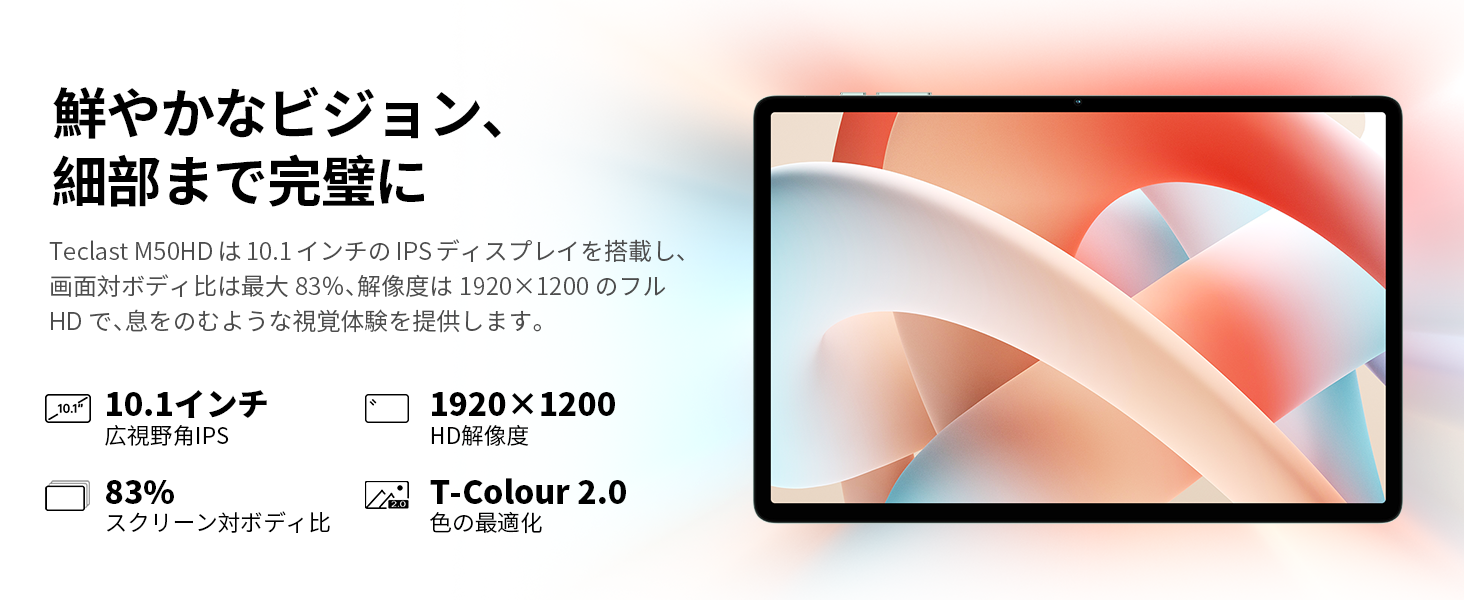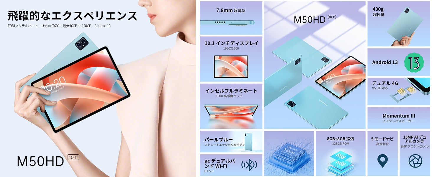 Teclast M50HDは10.1インチのフルラミネートフルHDスクリーンを搭載。消費電力と性能のバランスが取れたUnisocT606オクタコアプロセッサを搭載し、8GBのRAMと128GBのストレージを備えています。外観の美しさと内部のパワーのバランスが取れています。IPSディスプレイを搭載し、画面対ボディ比は最大83%、解像度は1920×1200のフルHDで、息をのむような視覚体験を提供します。洗練されたパールブルーのカラーパレットを採用し、わずか7.8mmの薄さと約435gの軽量なストレートエッジのメタルデザインによって引き立てられています。