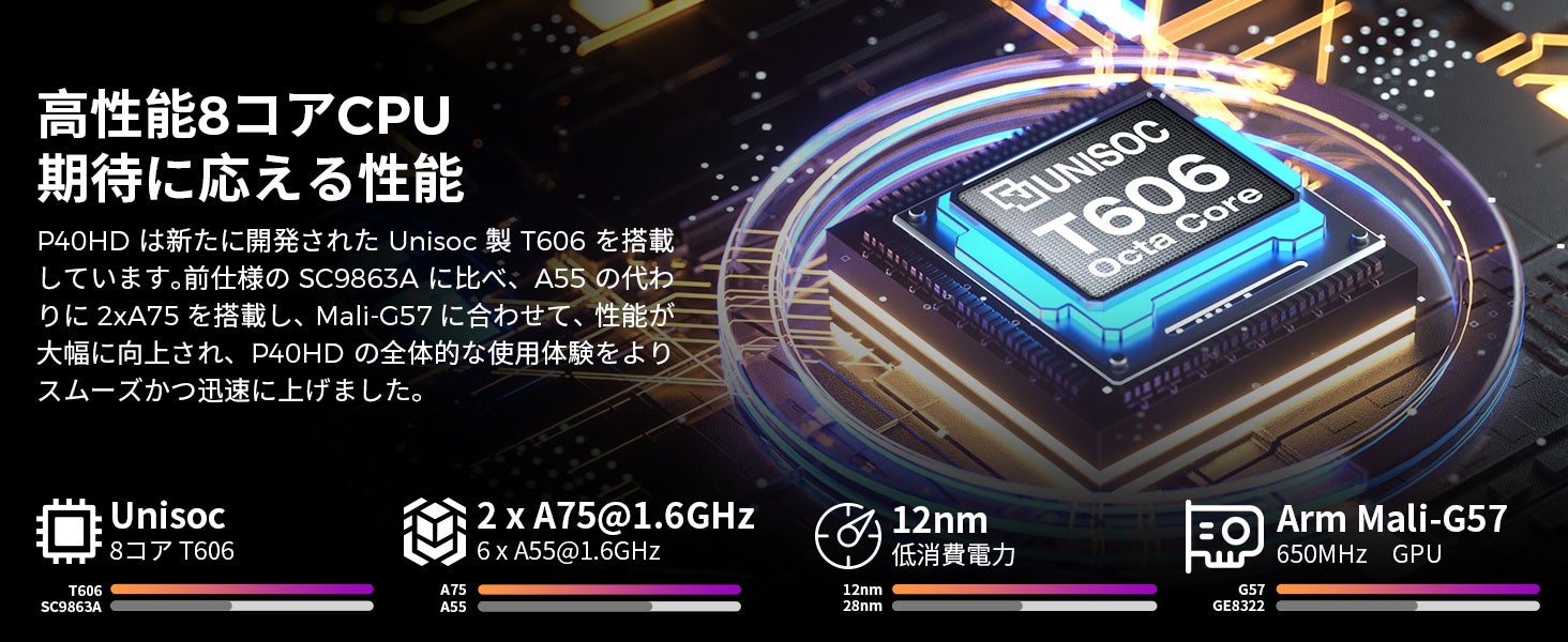 P40HDは新たに開発されたUnisoc製T606を搭載しています。前仕様のSC9863Aに比べ、A55の代わりに2xA75を搭載し、Mali-G57に合わせて、性能が大幅に向上され、使用体験をよりスムーズかつ迅速に上げました。アップグレード完成した「P40HD」は8GBの高速LPDDR4X RAMを誇り、最大8GBの仮想メモリー拡張を提供します。更に、128GBのストレージチップを搭載し、最大1TBのMicro SDカードによる容量拡張に対応するなど、ニーズに合わせたストレージソリューションも提供します。