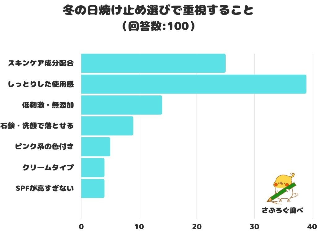 冬の日焼け止め選びで重視することをアンケートにて調査したところ、1位は「しっとりした使用感」 でした。
