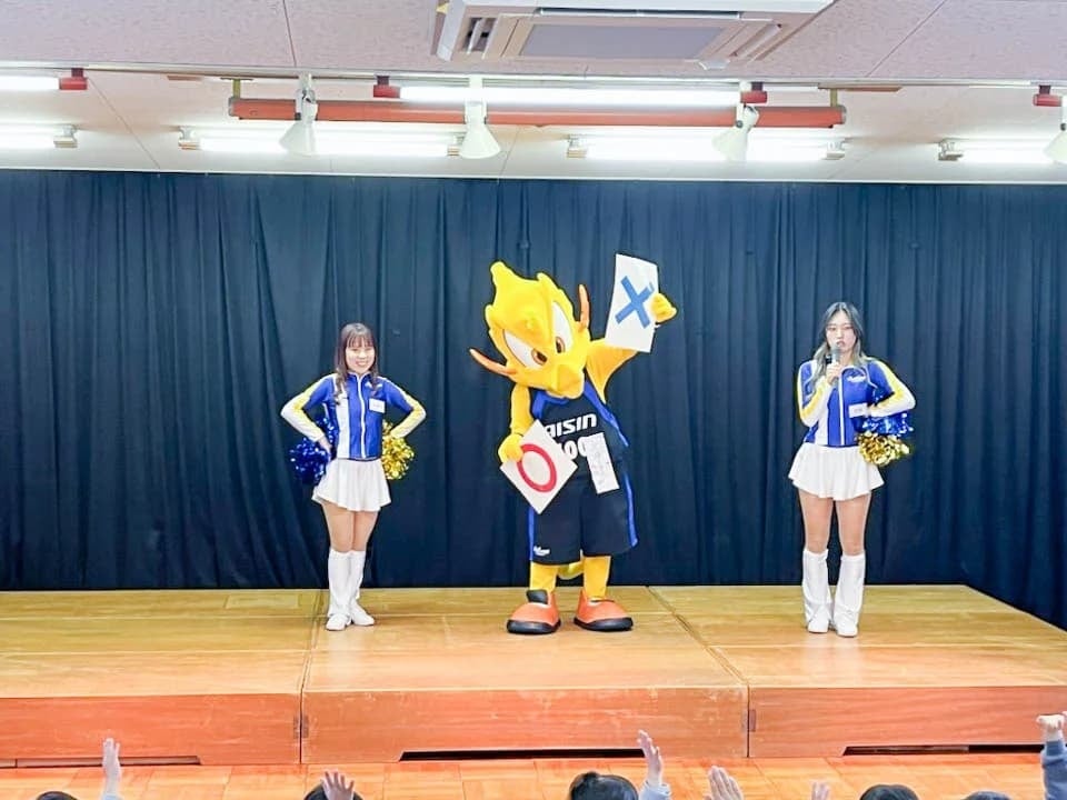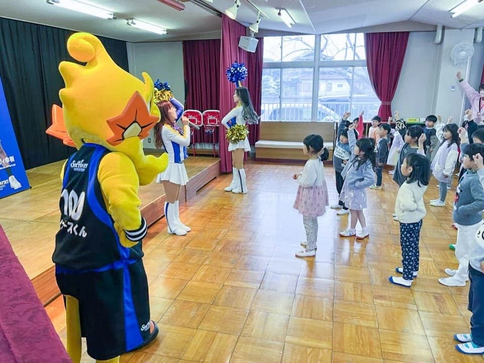 2024年3月5日(火)、シーホースくんとSuper GirlsのMIYUU、SAHOが志貴保育園(安城市)を訪問し、園児の皆さんと一緒にクイズやダンスを楽しみました。