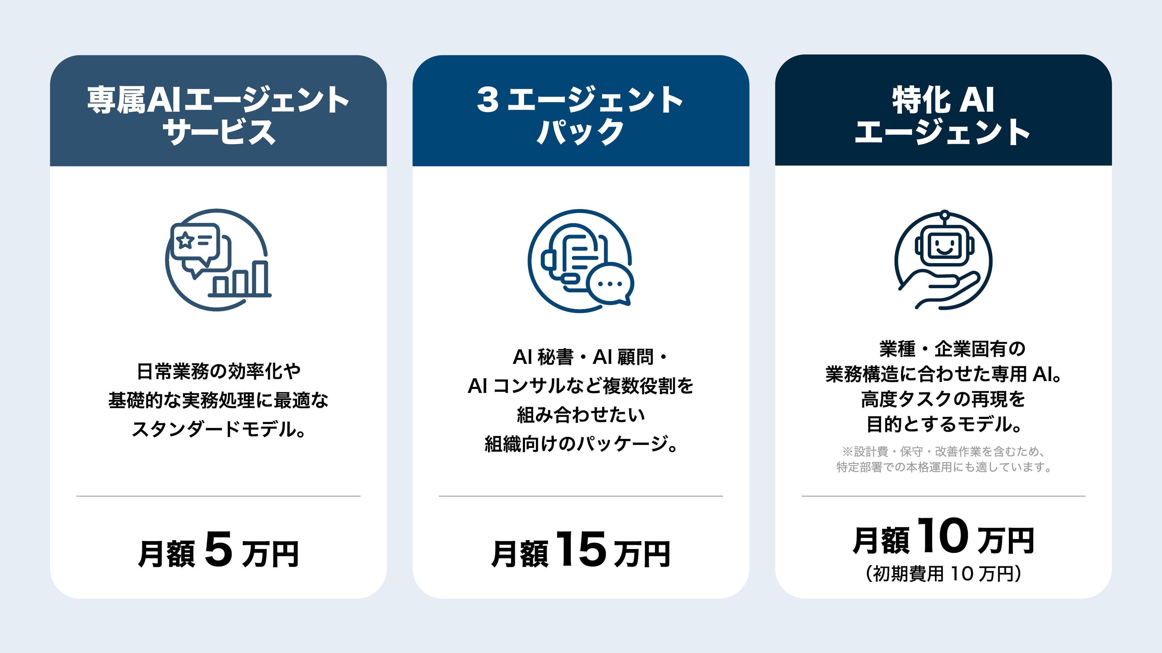 ・特化AIエージェント:月額10万円(初期費用10万円)