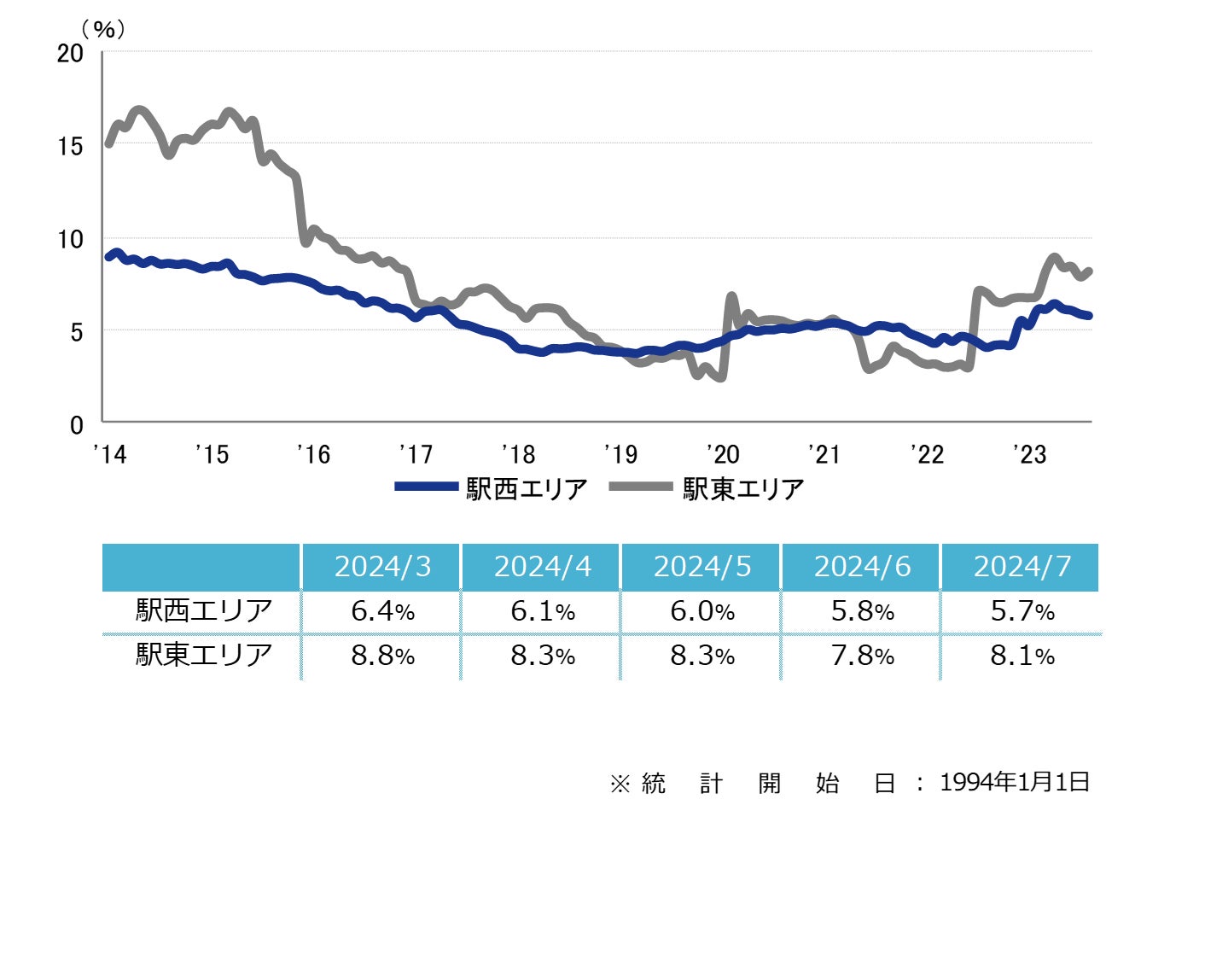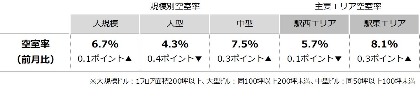 空室率は前月比マイナス0.02ポイントの6.29%と、前月からほぼ横ばいとなった。市内での拡張移転等により空室が生じた一方、新築・築浅ビルを中心に空室消化が進み、わずかな動きに止まっている。潜在空室率は前月比プラス0.02ポイントの7.62%だった。