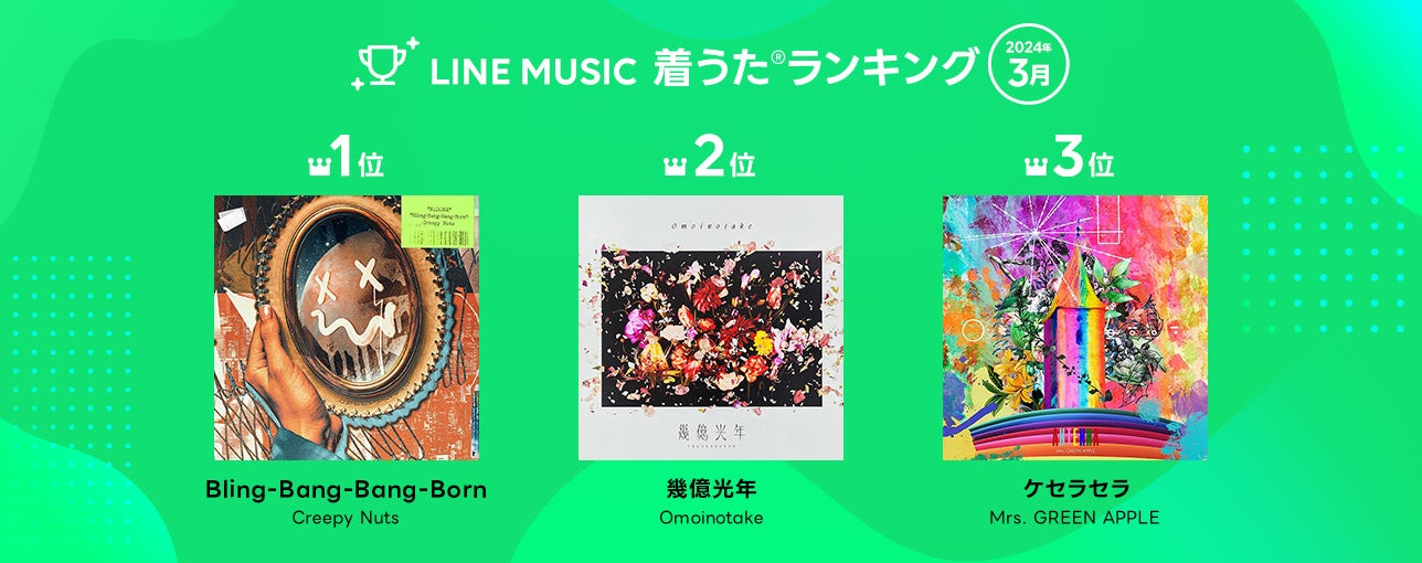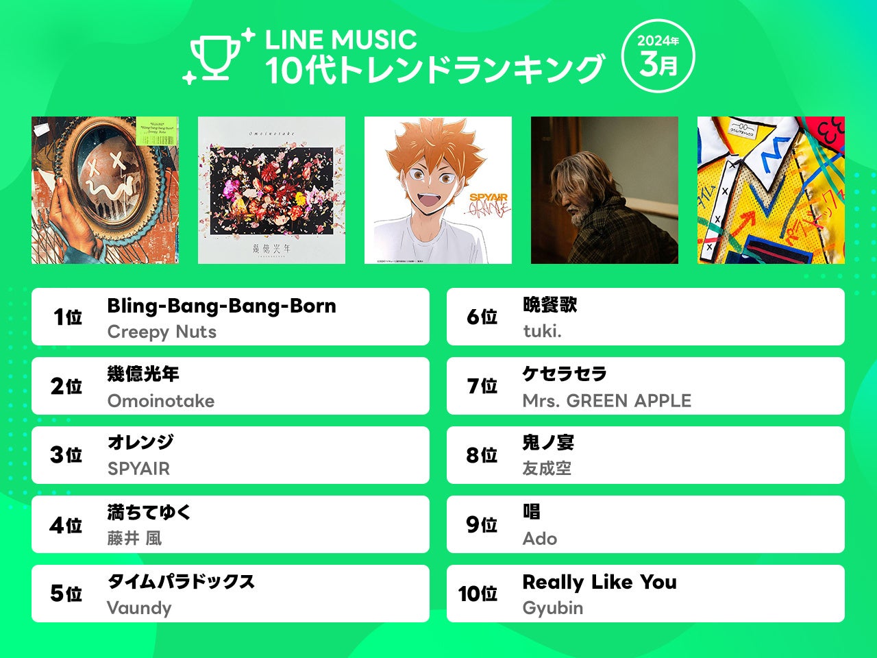 【LINE MUSIC 2024年3月月間ランキング】Creepy Nuts「Bling-Bang-Bang-Born」が先月から引き続き今月も1位に