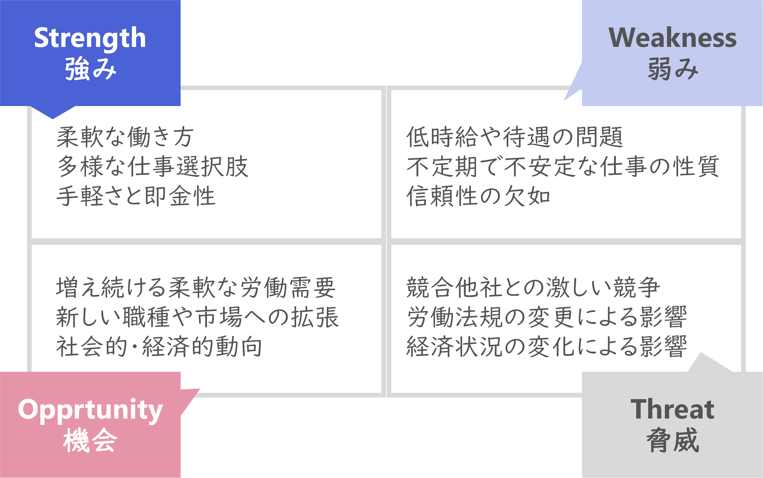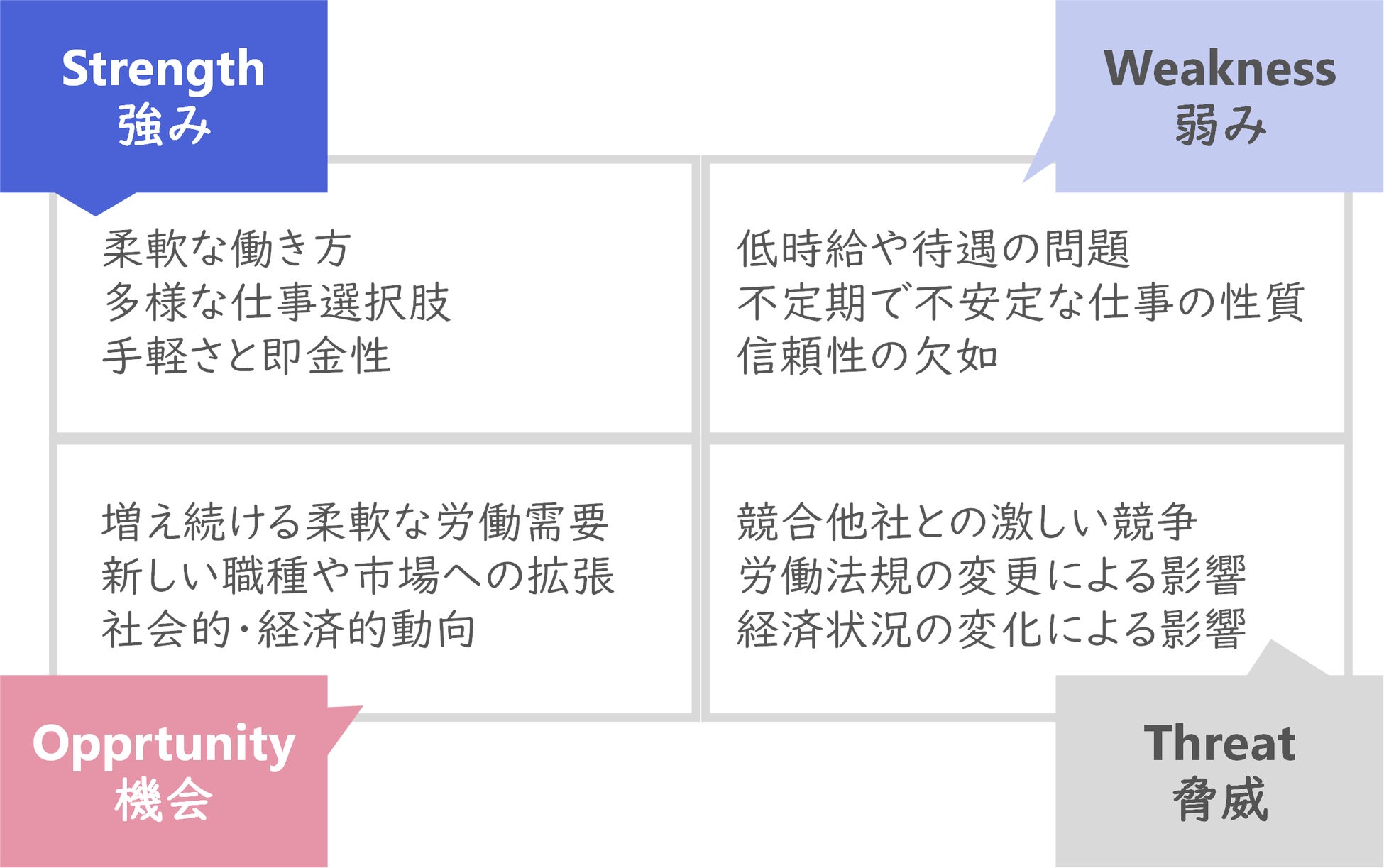 SWOT分析から明らかになる通り、スキマバイトは多くの機会を持ちながらも、一定の脅威に直面しています。