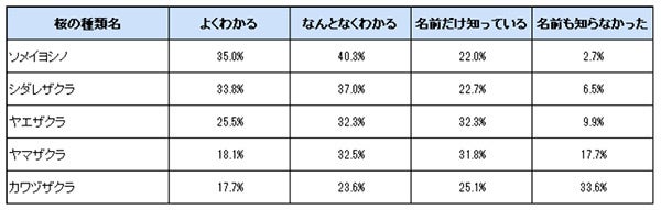 桜には色々な種類があり、その違いを知るのも楽しいものです。「以下の桜の種類について、その特徴がどのくらいわかるかについてお答えください」という質問の結果を見てみましょう。