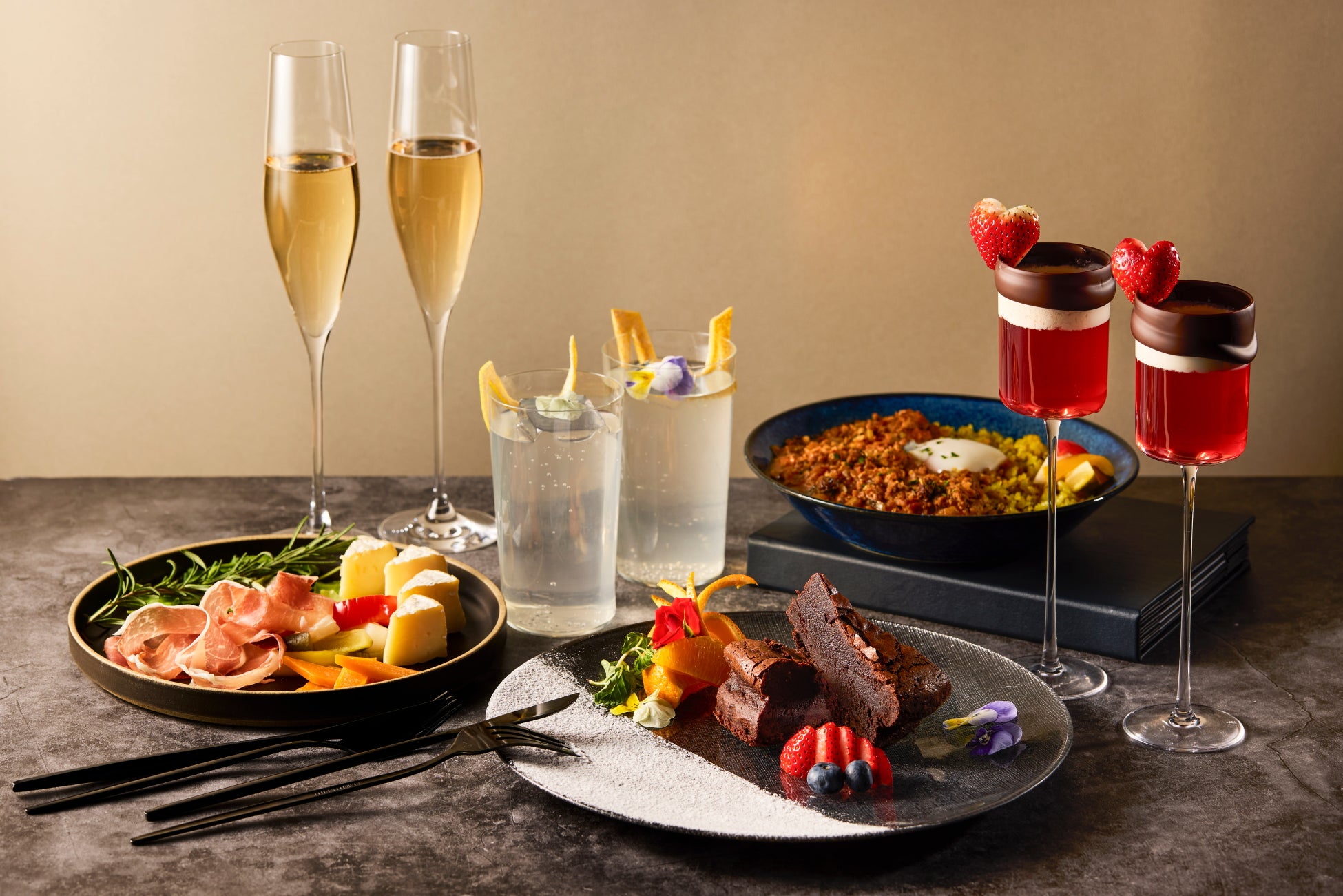 こちらの記念日プランでは、オリジナルカクテルを含む3種のアルコールとフードのペアリングをお楽しみいただけます。前菜と相性の良いシャンパン、人気フードメニューのカレーライスとオリジナルのジントニック、そしてデザートのガトーショコラと共にお出しするのは、フレーバーブラスターを使った遊び心あふれる本プラン限定のオリジナルアニバーサリーカクテルです。また、2月1日(土)~2月15日(土)の期間限定で、バレンタイン特製カクテルを楽しめる特別プランをご用意しております。大切な方とのバレンタインステイにぜひご利用ください。
