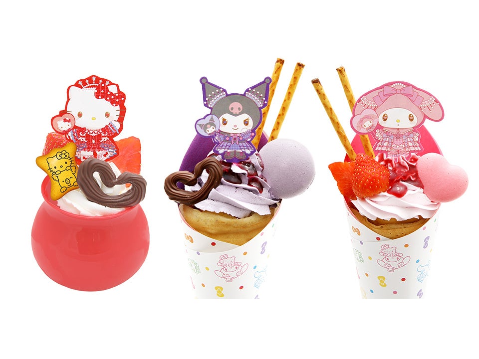 シナモロールドリームカフェでは、かわいいハート形の「ガーナリップル」と「コアラのマーチ」を使用した「ハローキティの赤推し♡とろけるプリンのKAWAIIサンデー」を販売。サンリオレインボーワールドレストランで販売するのは「ガーナリップル」と最後までチョコレートたっぷりの「トッポ」で飾り付けをした「クロミの紫推し♪キューティーベリークレープ」と、同じく「トッポ」で飾り付けをした「マイメロディのピンク推し♡ラブリーベリークレープ」です。どれも推しカラーとキャラクターとがマッチしたメニューとなっています。