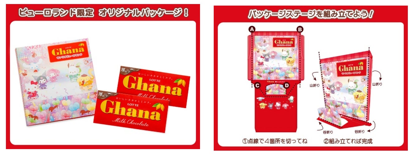イベント期間中は、 3F エントランスホールに登場するフォトスポットに加えて、ピューロランド限定でオリジナルパッケージのガーナチョコレートを数量限定で販売します。パッケージを組み立てると、アクリルスタンドを飾ることができるステージのようなフォトスポットに大変身します。また中に入っているガーナミルクの外箱にメッセージを書いて、誰かに気持ちを伝えることができます。