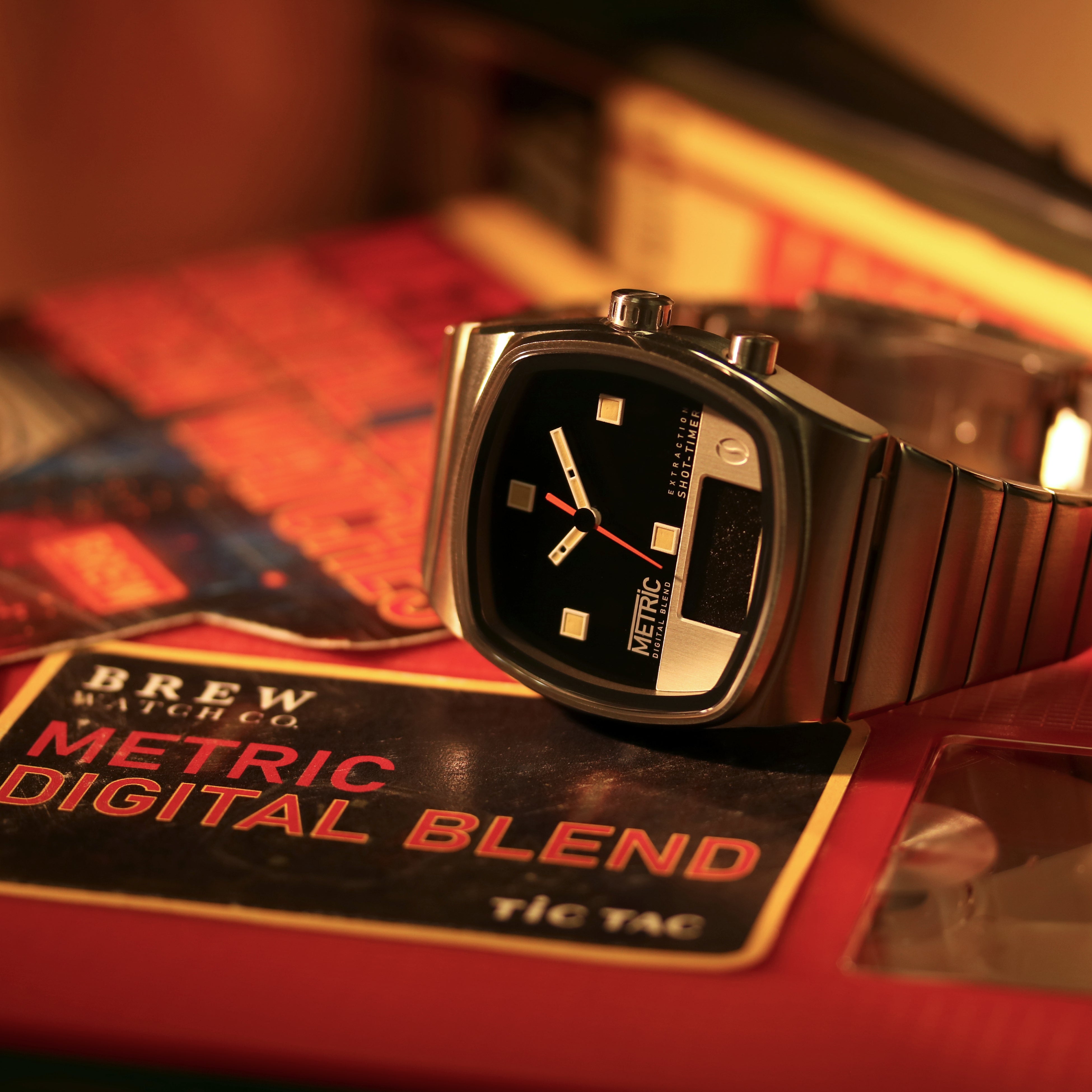 ブランドを代表する“Metric”シリーズの、70年代のブラウン管テレビのようなクッションケースをベースに、クラシックなアナログ時計とデジタルLEDエスプレッソタイマーを融合させた、世界初のハイブリッドウォッチ※“METRIC DIGITAL BLEND”。30秒のカウントダウン機能と遊び心あふれるコーヒーカップの抽出アニメーションという限定的な機能ではあるが、スタイリッシュかつダイナミックなデザインで完璧な抽出タイミングを演出してくれる。