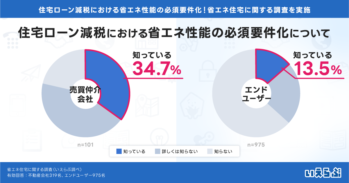 「2024年1月より住宅ローン減税で省エネ基準への適合が必須となることを知っていますか?」とたずねたところ、「知っている」と答えた売買仲介会社は34.7%、エンドユーザーは13.5%となりました。