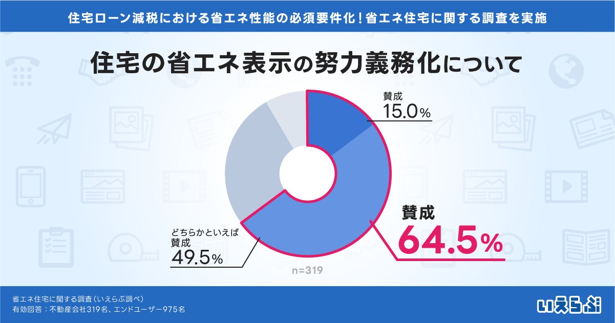 不動産会社に対して「住宅の省エネ表示の努力義務化」について賛否をたずねたところ、「賛成」「どちらかといえば賛成」が64.5%になりました。