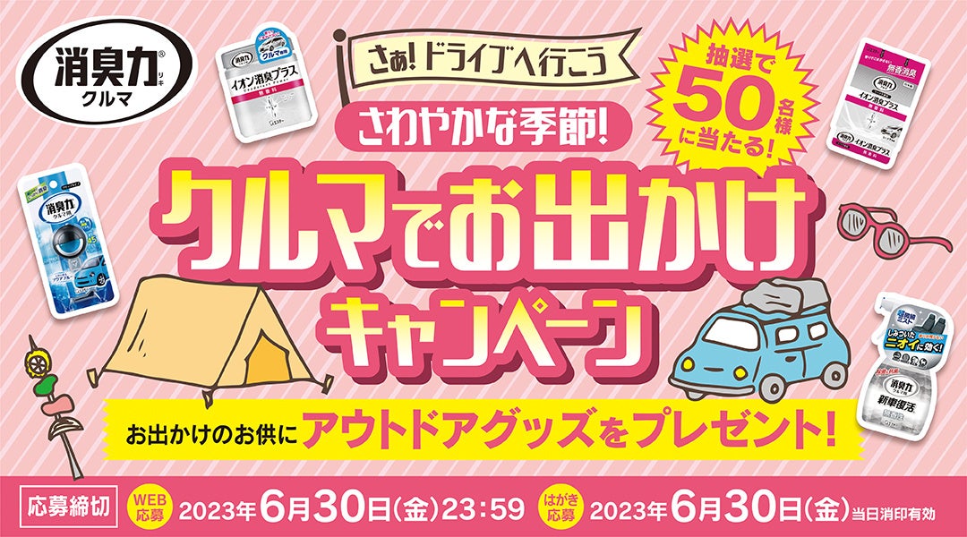 過ごしやすい季節を迎え、アウトドアライフを楽しめるこの時期に、「消臭力 クルマ用」シリーズを使用してもらうことで、皆さまの日々のドライブをちょっと楽しく快適にすることを応援するキャンペーンです。